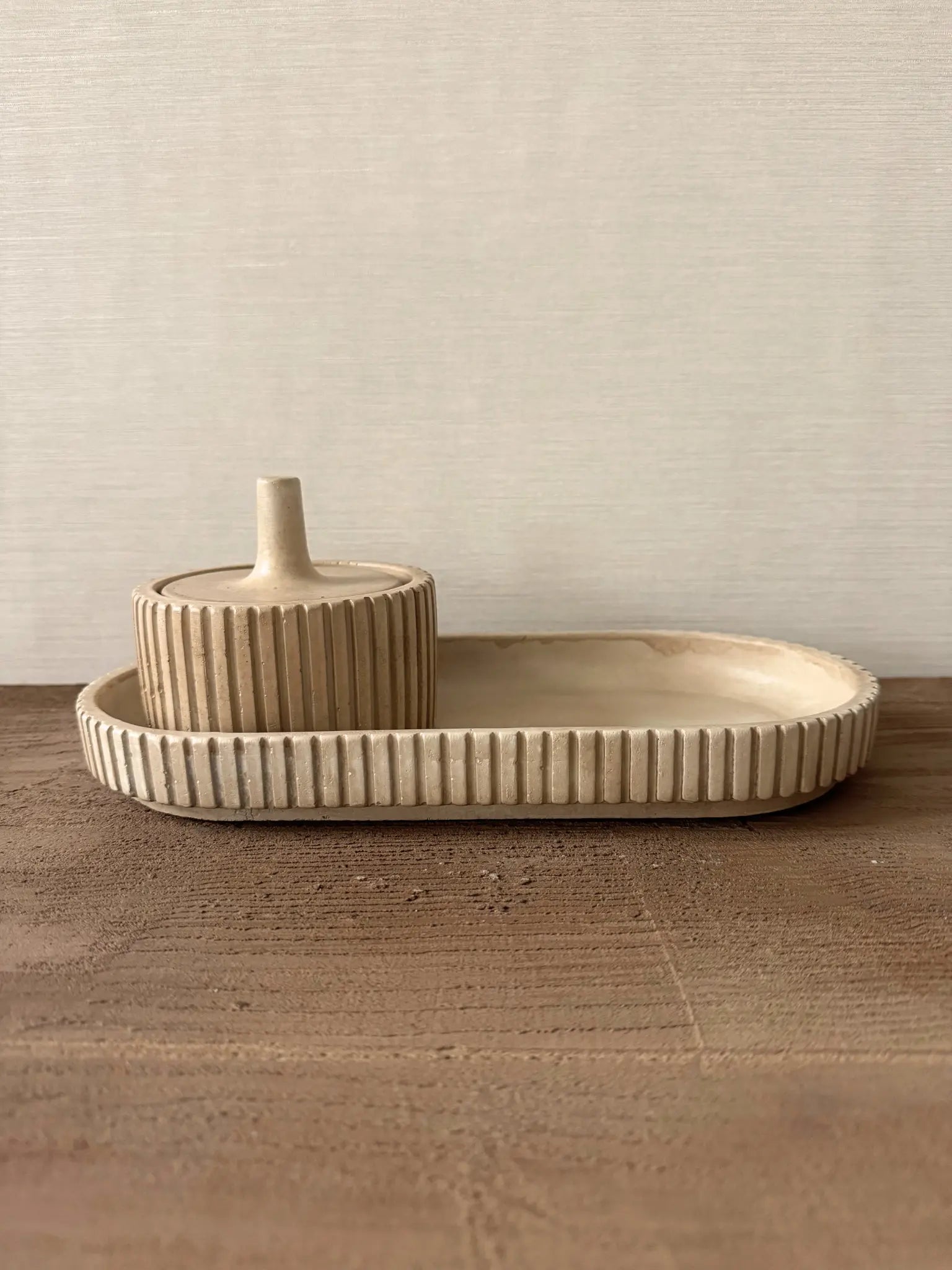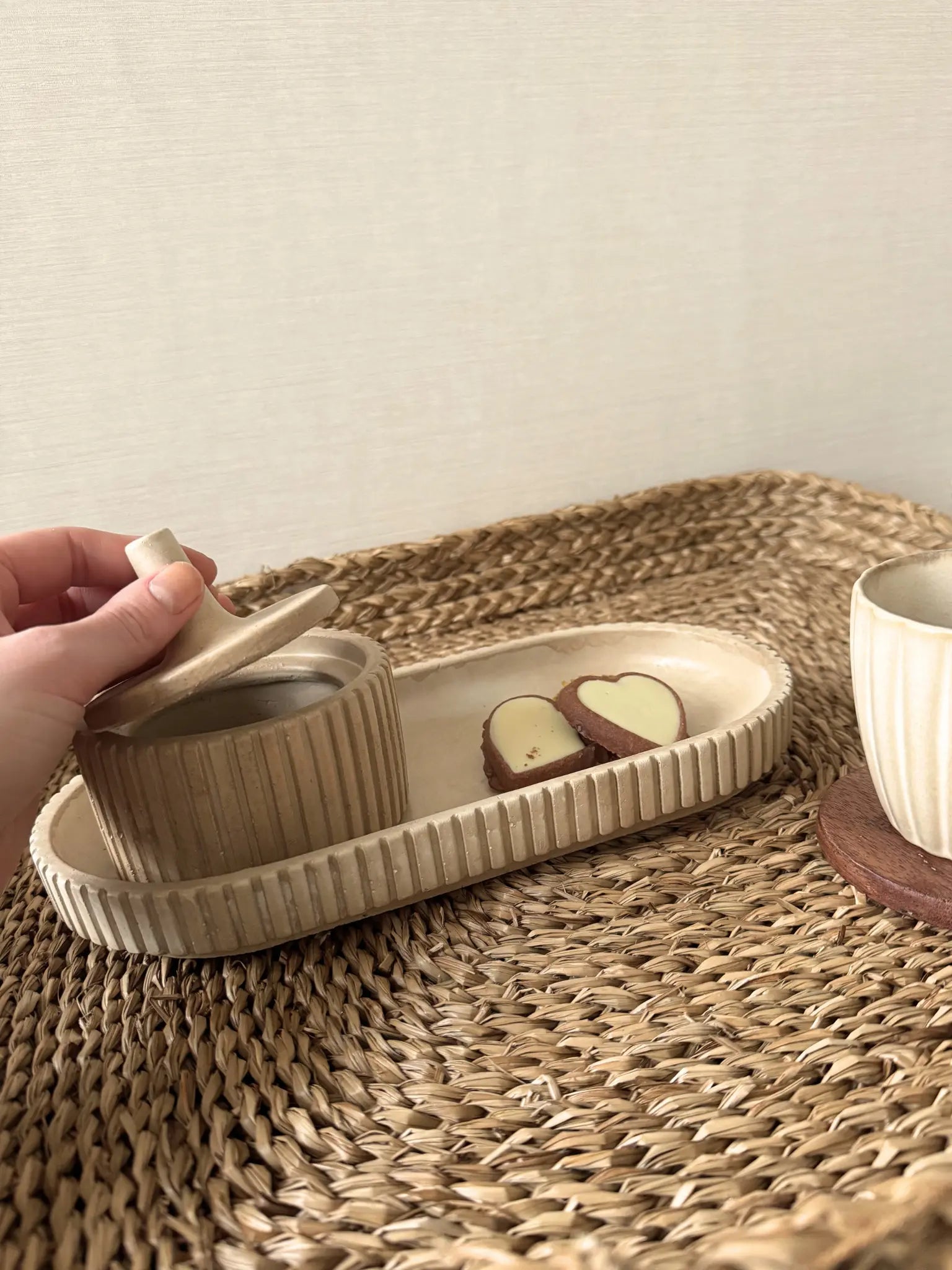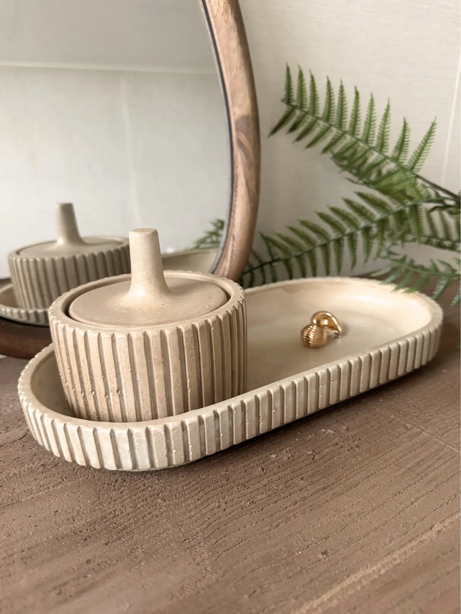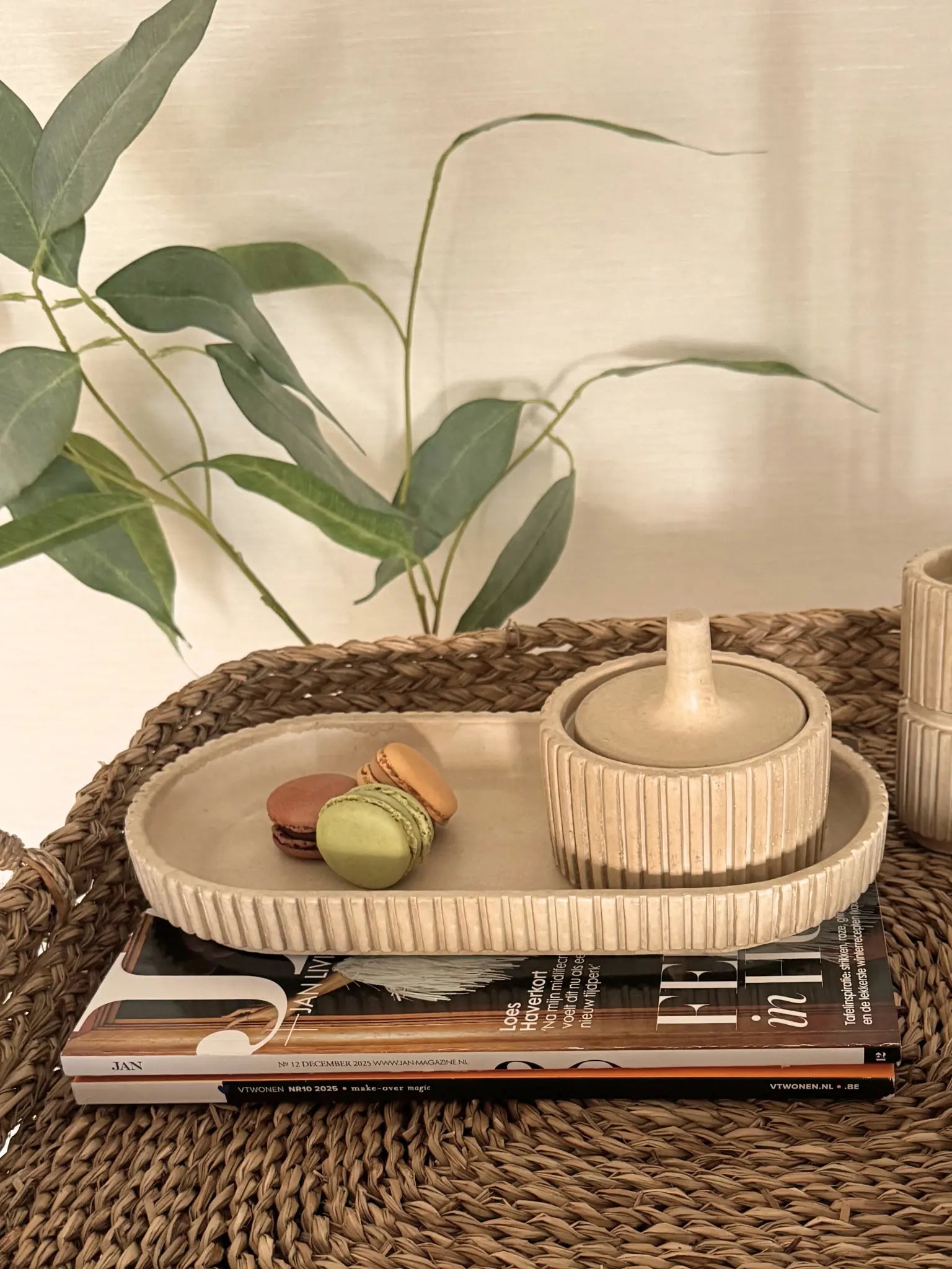 Deze set bestaat uit een stijlvol aardewerk dienblad met een bijpassend potje met deksel. De zachte beige tint en het rustgevende ontwerp maken het een mooie toevoeging voor in de keuken, op een koffietafel of op een dressoir. Het potje is ideaal voor suiker, theezakjes of kleine items die je graag netjes en mooi wilt opbergen. Het dienblad kun je gebruiken om alles bij elkaar te houden of om kleine decoraties te stylen. Beide onderdelen voelen stevig aan en geven je interieur een warm en huislijk detail.