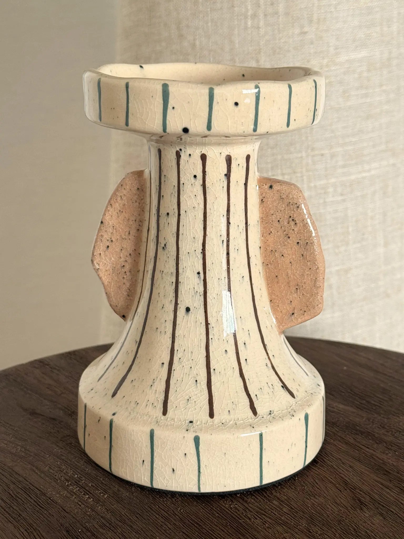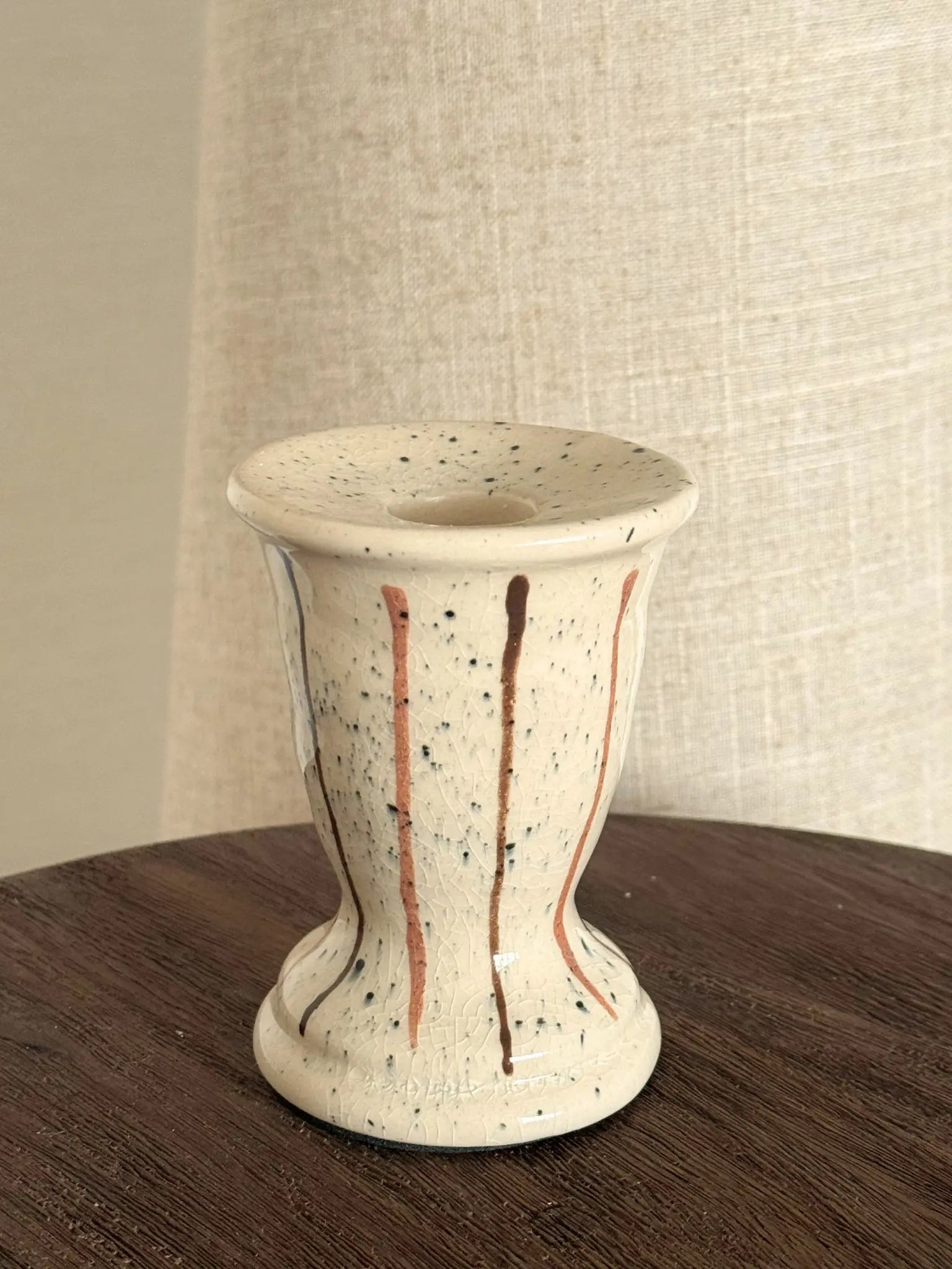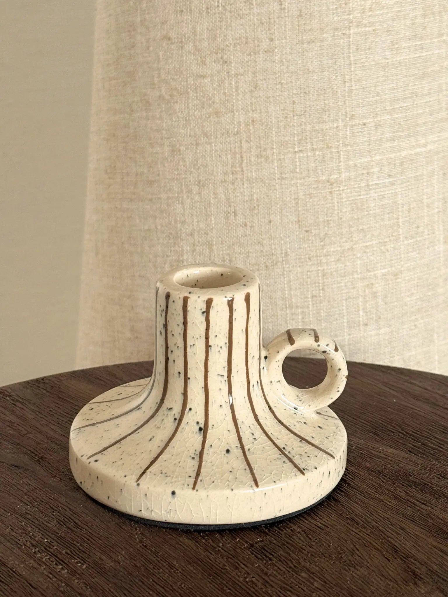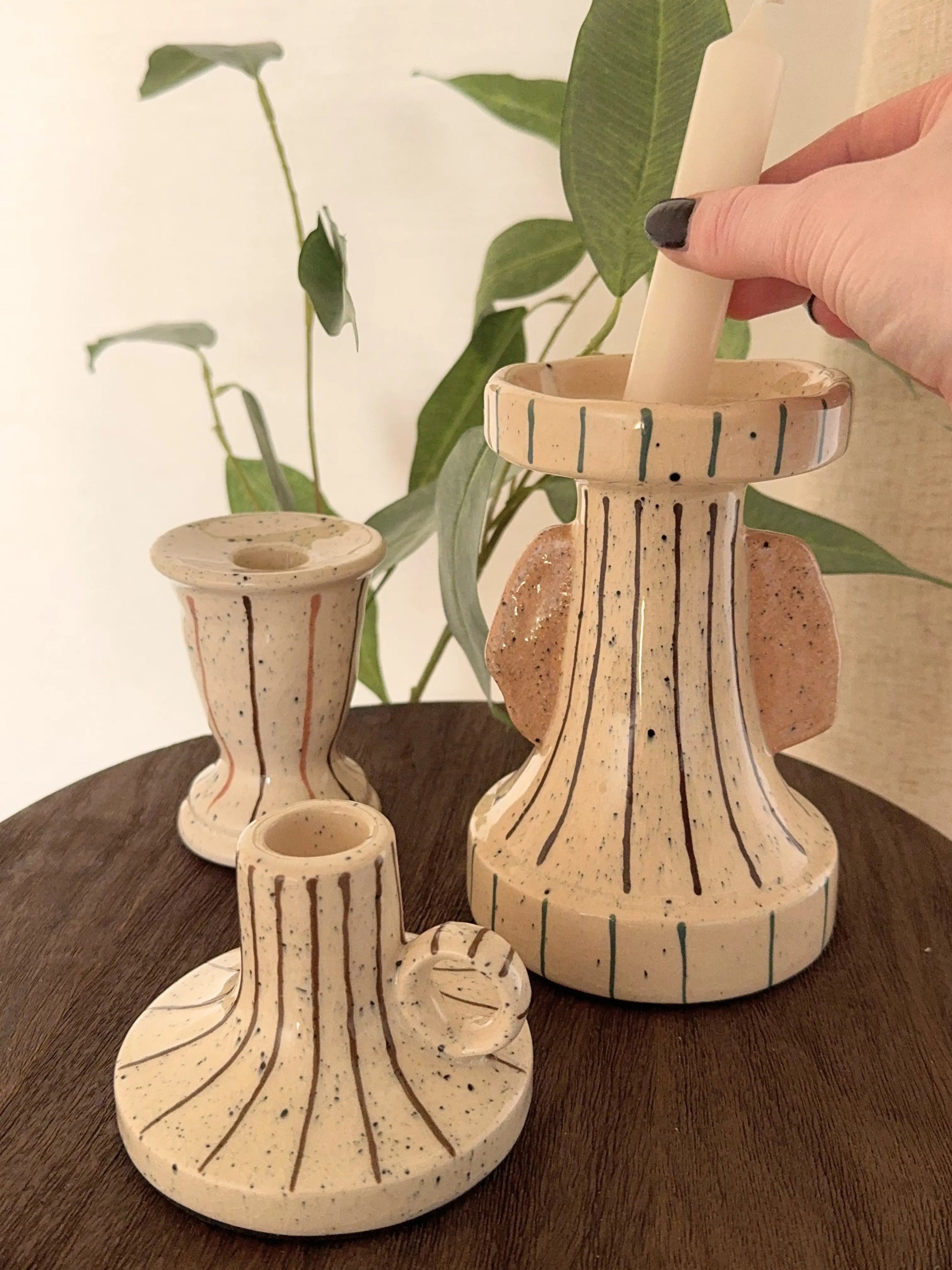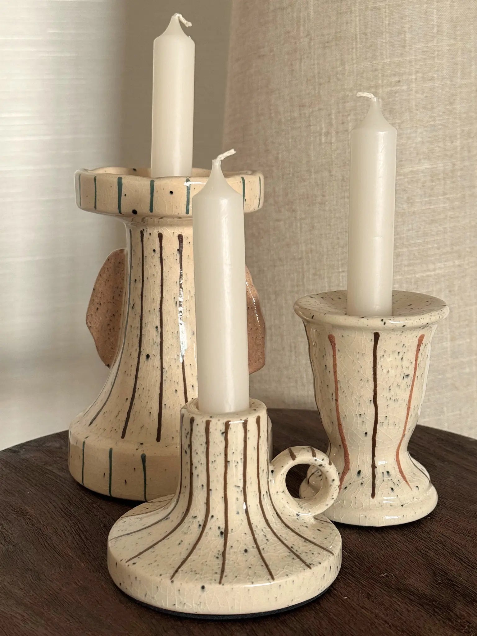 Deze gestreepte kaarsenhouders brengen meteen een zachte en sfeervolle uitstraling in huis. De beige kleur en het subtiele reliëf geven een rustige en natuurlijke look die mooi past bij verschillende interieurstijlen. Je kunt ze los neerzetten of als set combineren voor een speels en warm effect. Het aardewerk voelt stevig en kwalitatief aan en geeft een huislijk detail aan een tafel, kast of dressoir.