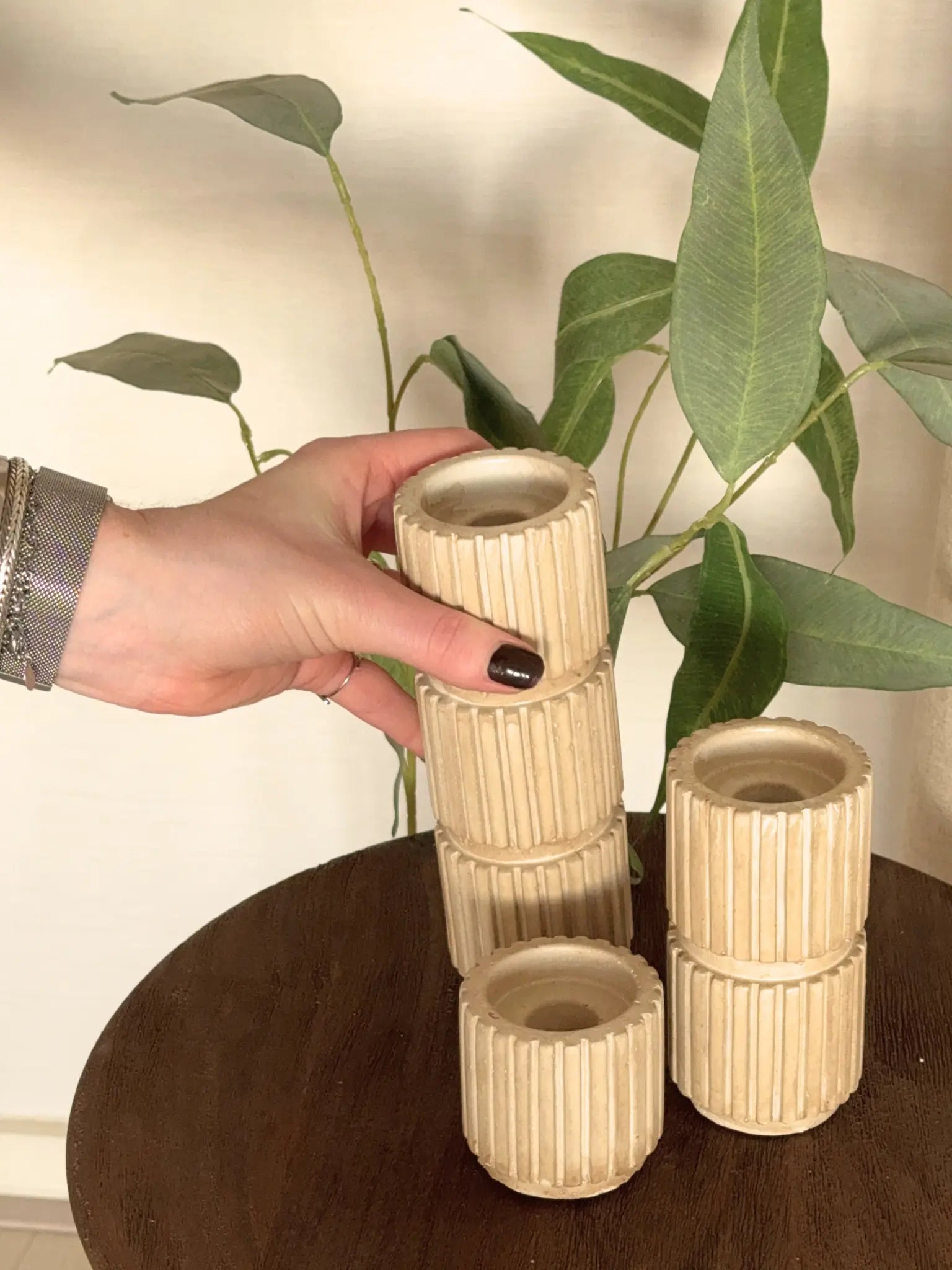 Deze kaarsenhouders hebben een rustige en tijdloze uitstraling die mooi past in een warm en sfeervol interieur. De beige kleur geeft een zacht en natuurlijk accent dat fijn te combineren is met andere materialen en tinten. Door de strakke vorm kun je ze los gebruiken of als set neerzetten voor een subtiel speels effect. Het aardewerk voelt stevig aan en geeft een huislijk detail aan een kast, tafel of dressoir.