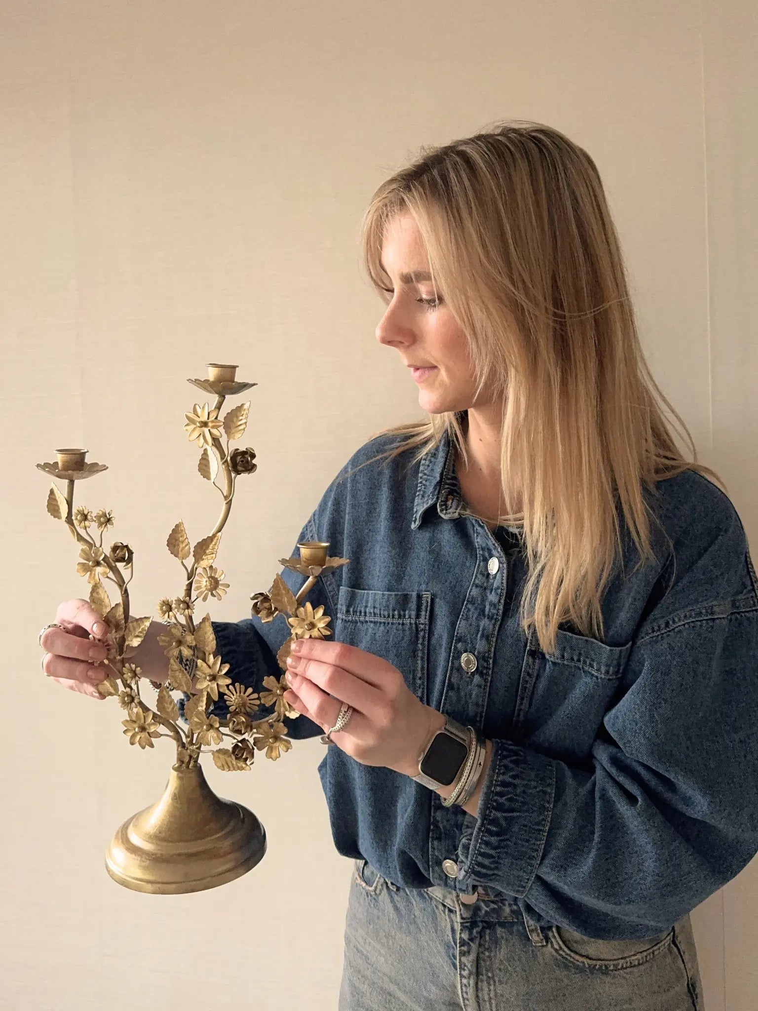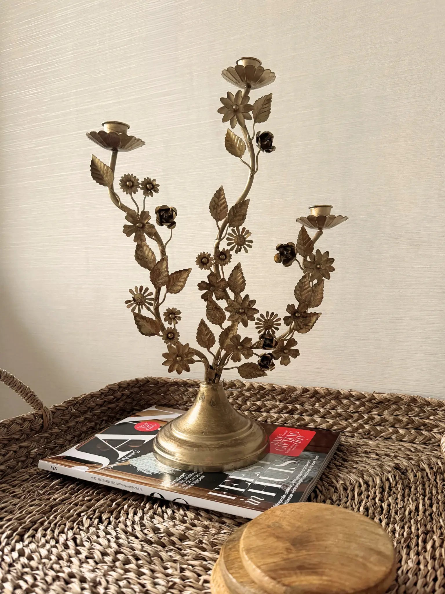 Deze kaarsenhouder is een echte sfeermaker in huis. De antiek gouden kleur en de gedetailleerde bloemen en blaadjes geven dit item een elegante en vintage uitstraling. Hij is met de hand gemaakt in India en heeft daardoor net wat extra karakter. De kaarsenhouder biedt ruimte voor drie kaarsen en staat prachtig op een gedekte tafel, dressoir of in een gezellig hoekje. Een decoratief item dat elke ruimte een warme en tijdloze sfeer geeft.