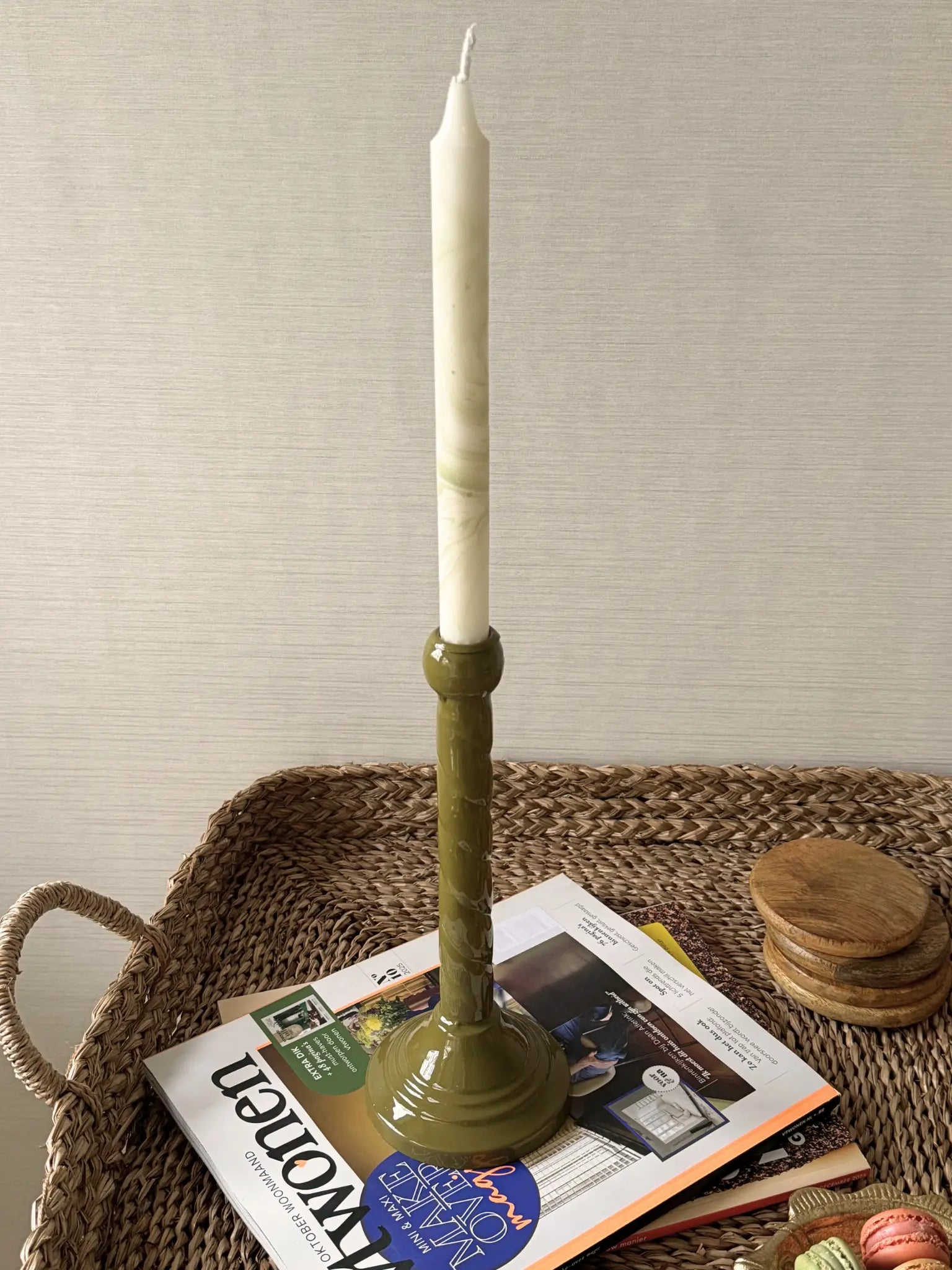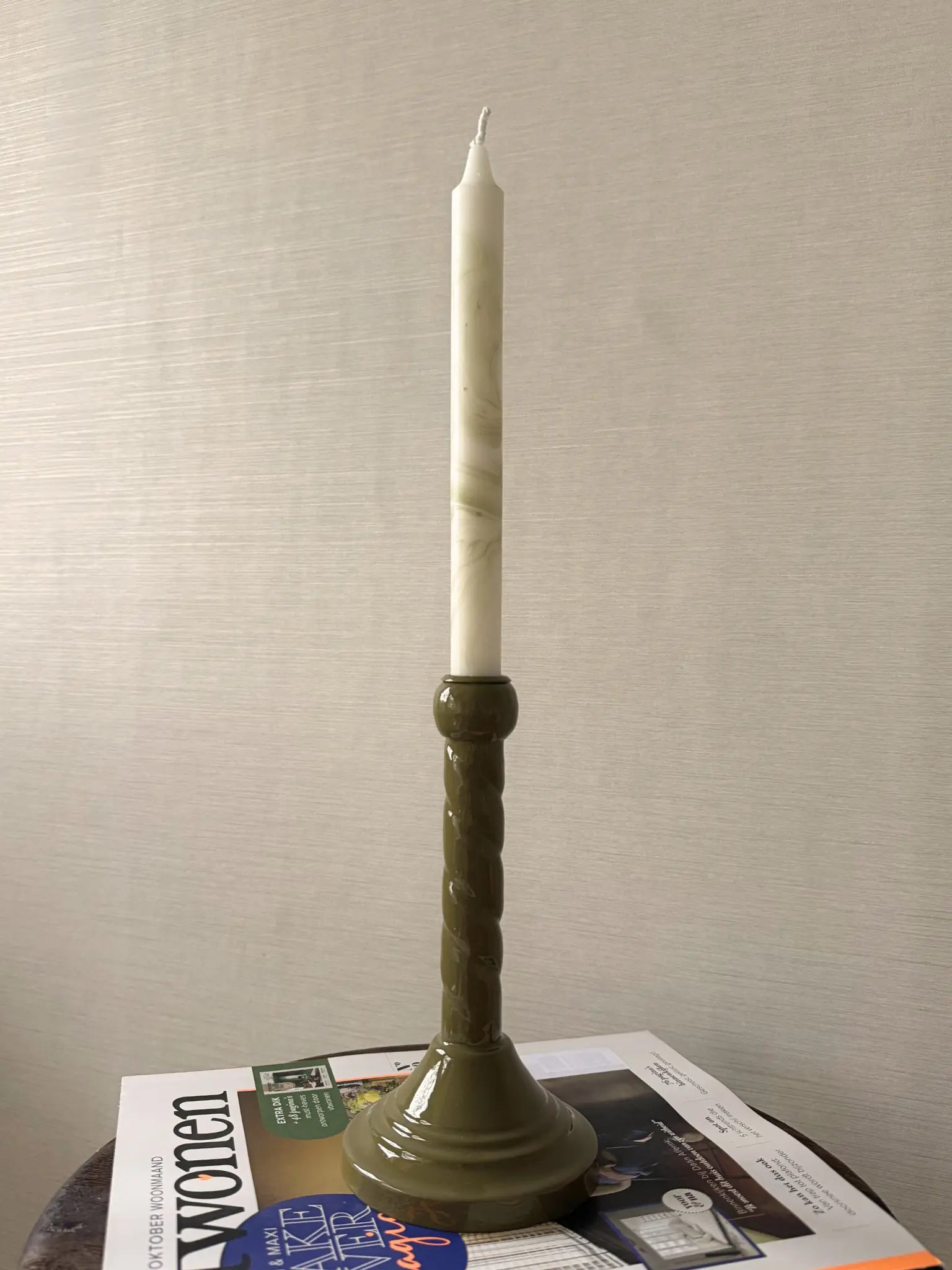 Kaarsenhouder Naleira brengt een warm en stijlvol detail in huis. De olijfgroene kleur zorgt voor een rustige en natuurlijke uitstraling die mooi past bij zachte neutrale tinten of juist als subtiel kleuraccent. Dankzij het ronde ontwerp en de twee verschillende hoogtes kun je ze prachtig samen stylen of los neerzetten voor een rustige look. Het metaal voelt stevig aan en geeft je interieur een modern en huislijk accent.