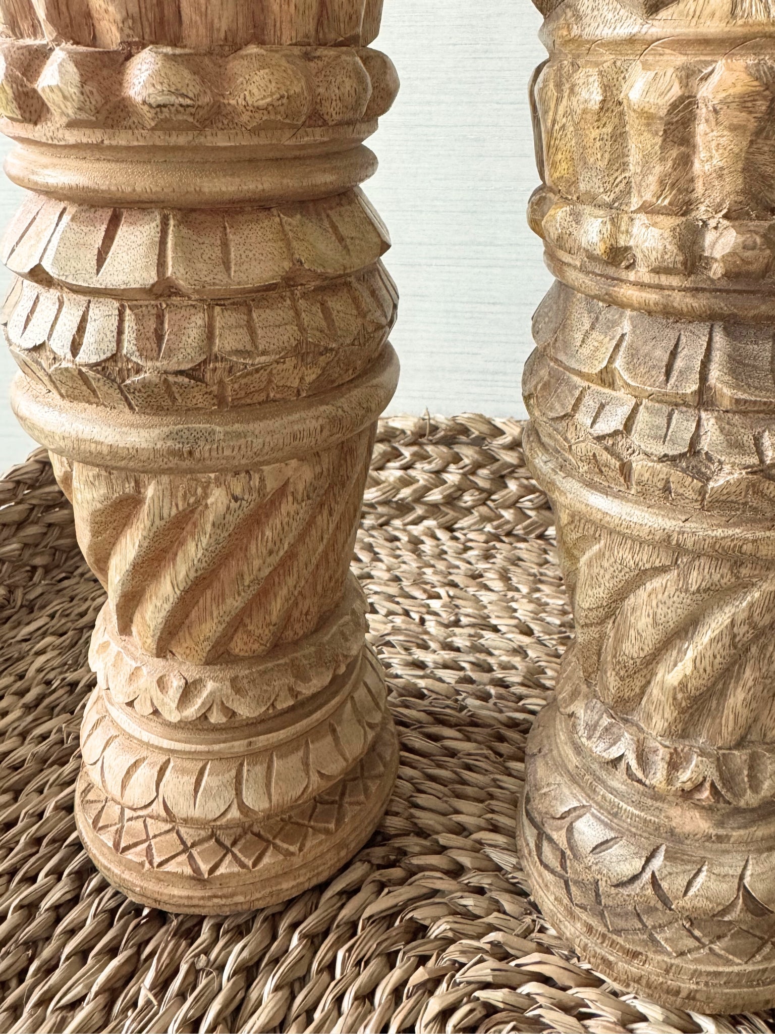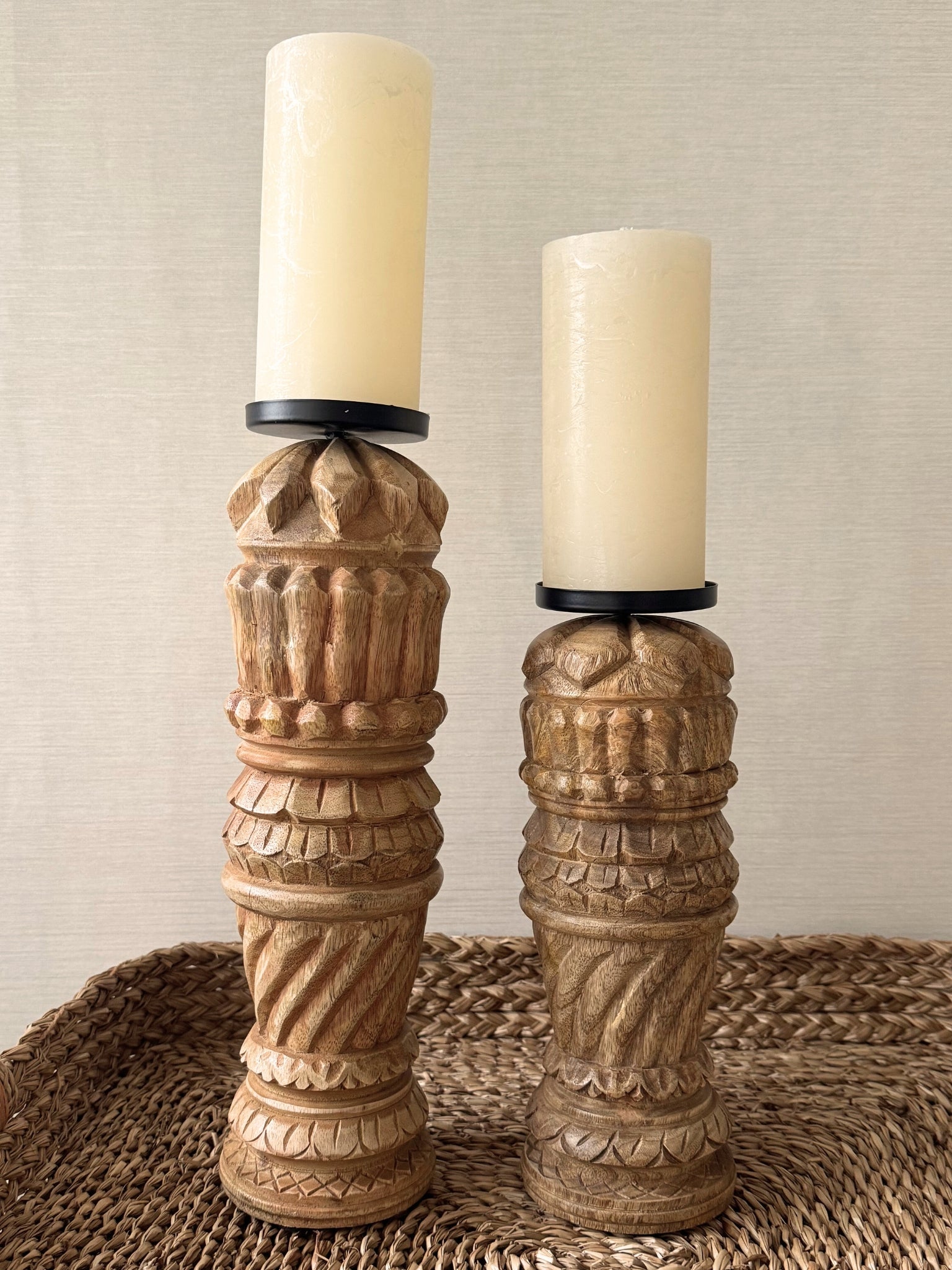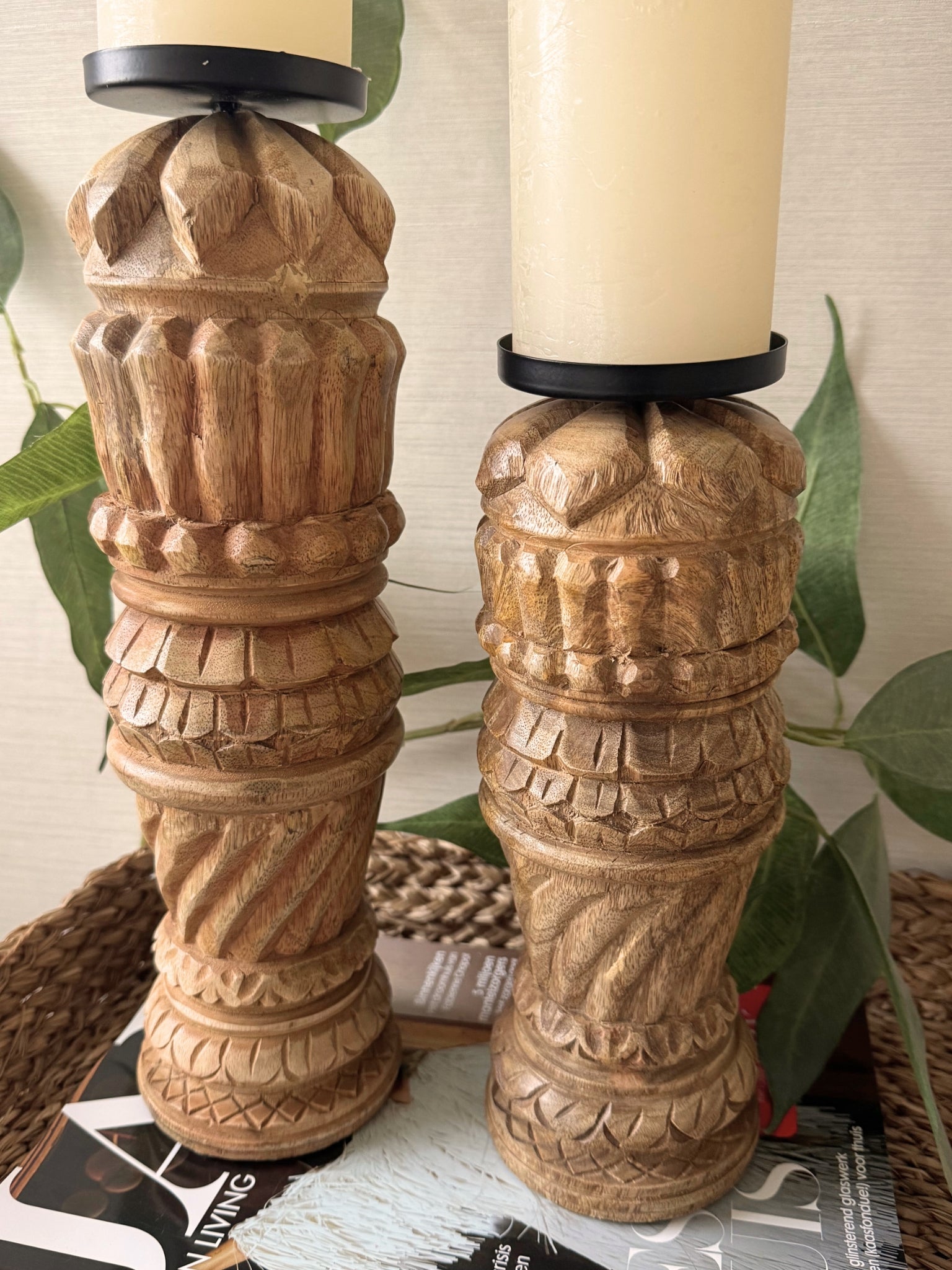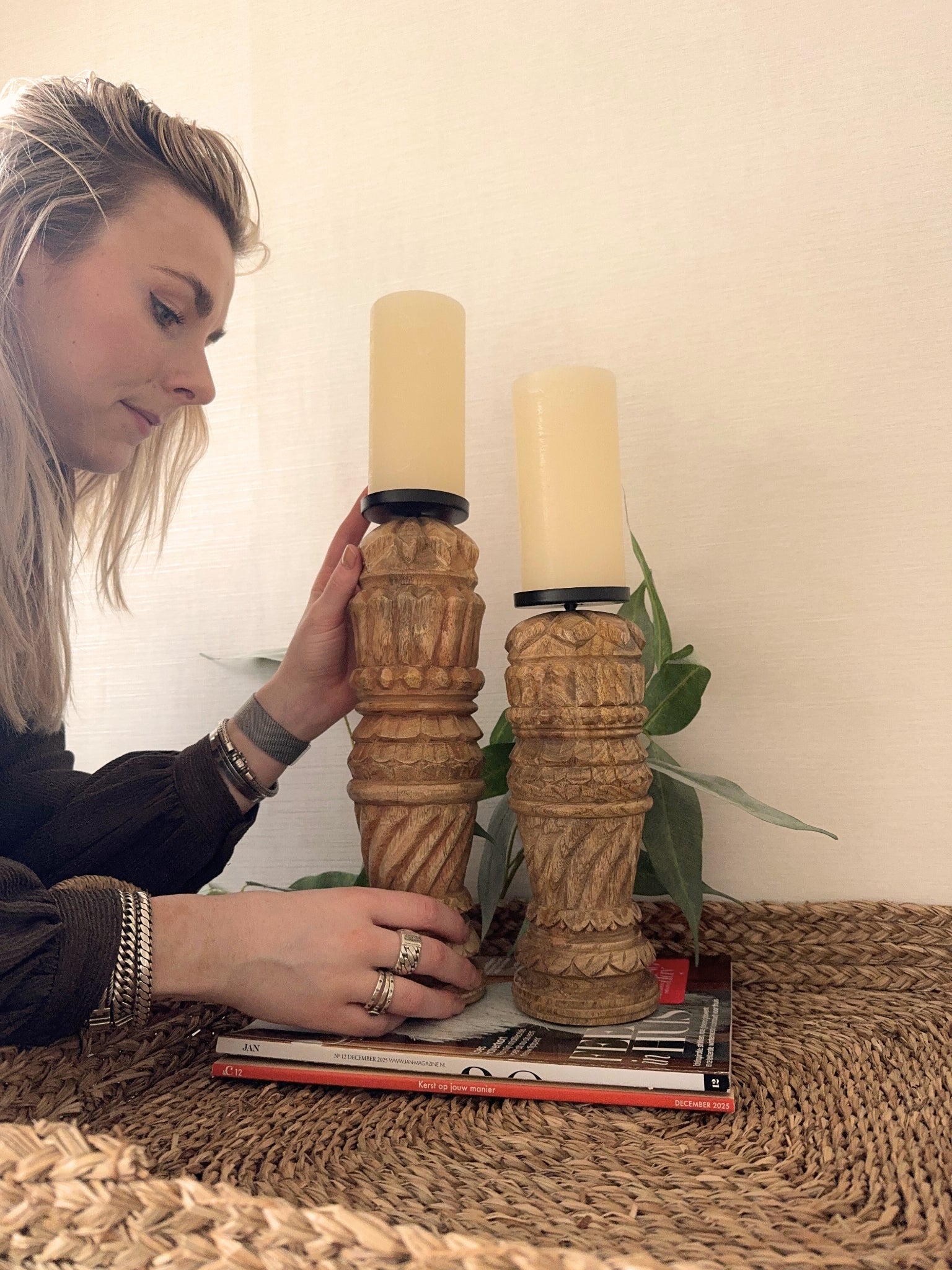 Deze kaarsenhouders van mangohout brengen direct warmte en sfeer in huis. Het natuurlijke hout heeft een mooie zachte tekening en een rustige uitstraling die moeiteloos past in een modern, landelijk of warm interieur. De vorm is eenvoudig maar stijlvol, waardoor ze op elke plek tot hun recht komen. De set wordt geleverd met offwhite blokkaarsen die prachtig contrasteren met het hout en meteen een gezellige uitstraling geven. Je kunt de houders los neerzetten voor een subtiel accent of juist samen voor een sfeervol geheel.