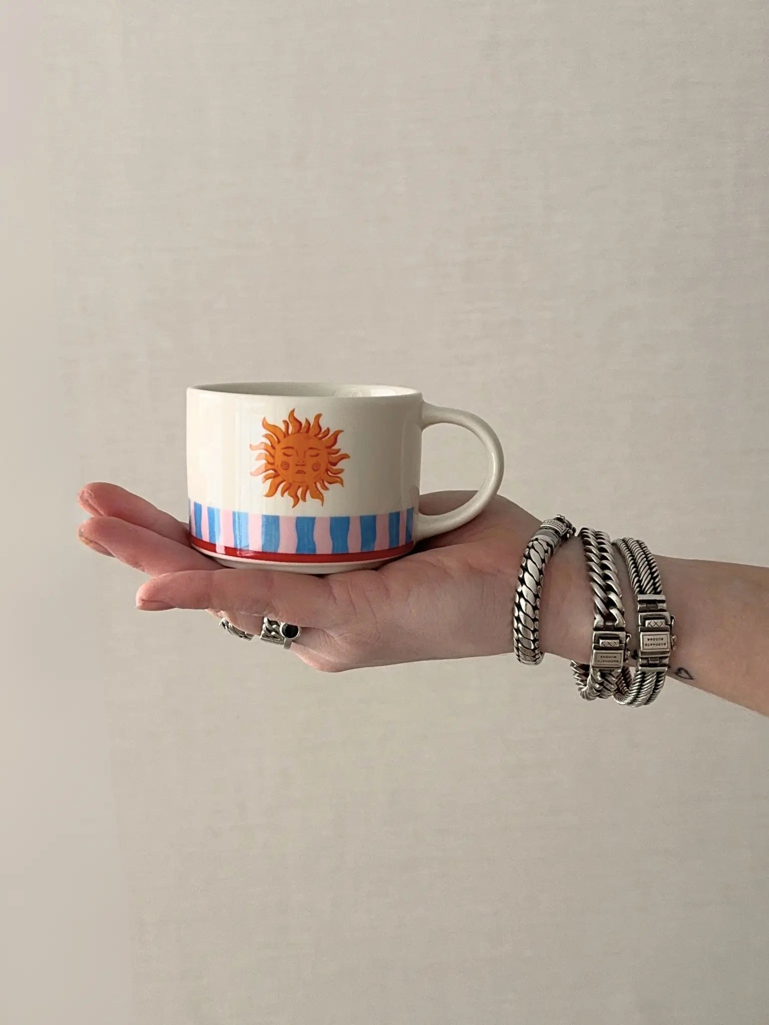 Koffiemok Solare brengt direct een zonnig en vrolijk gevoel naar je koffiemoment. De speelse kleuren geven de mok een frisse uitstraling en maken hem leuk om te gebruiken én om te laten zien in een open kast. Dankzij het oor ligt de mok prettig in de hand en is hij ideaal voor koffie, thee of een warme chocolademelk. Het keramiek voelt stevig aan en zorgt ervoor dat deze mok fijn is voor dagelijks gebruik. Een gezellige mok die elke dag net wat meer kleur geeft.
