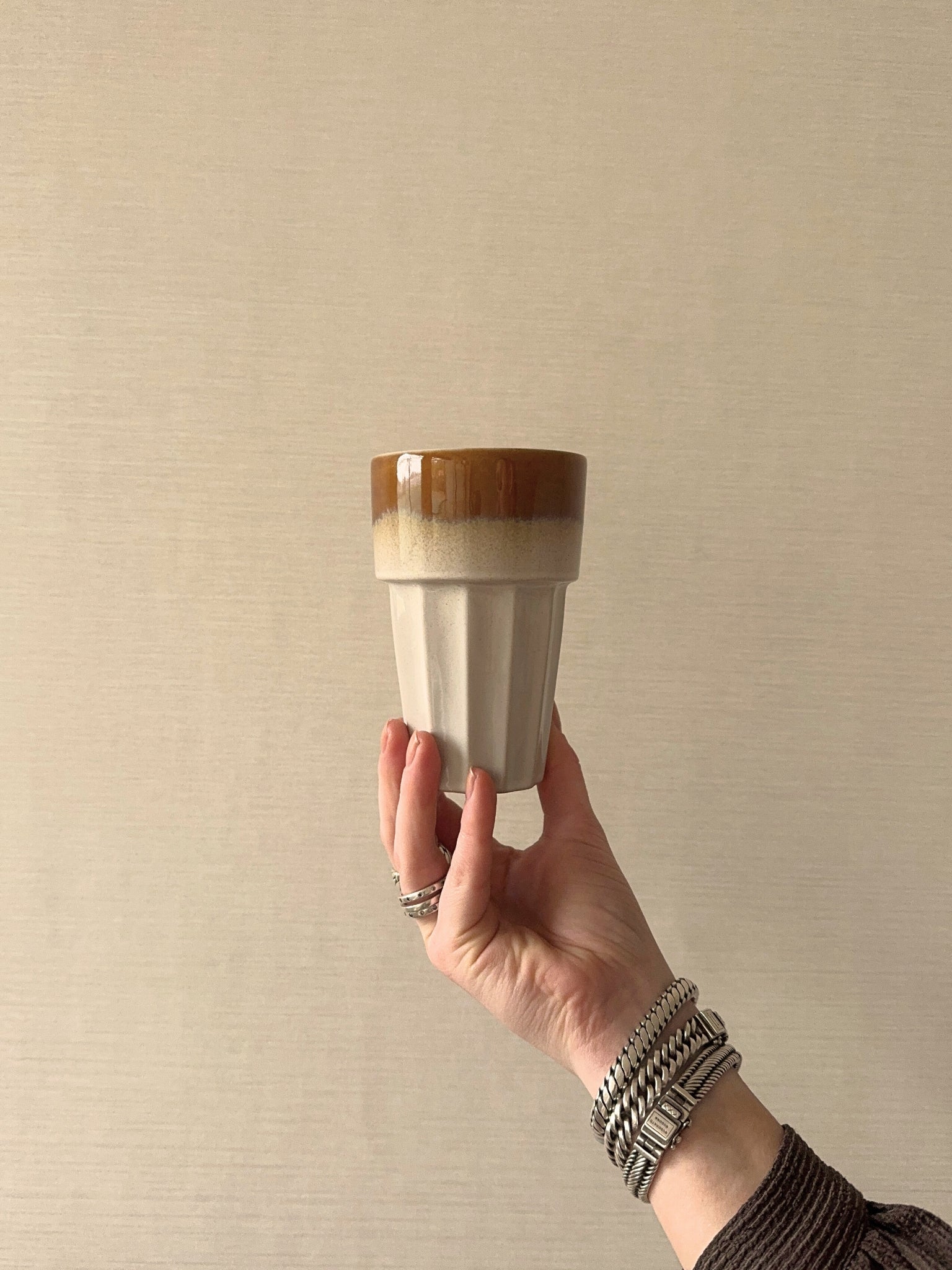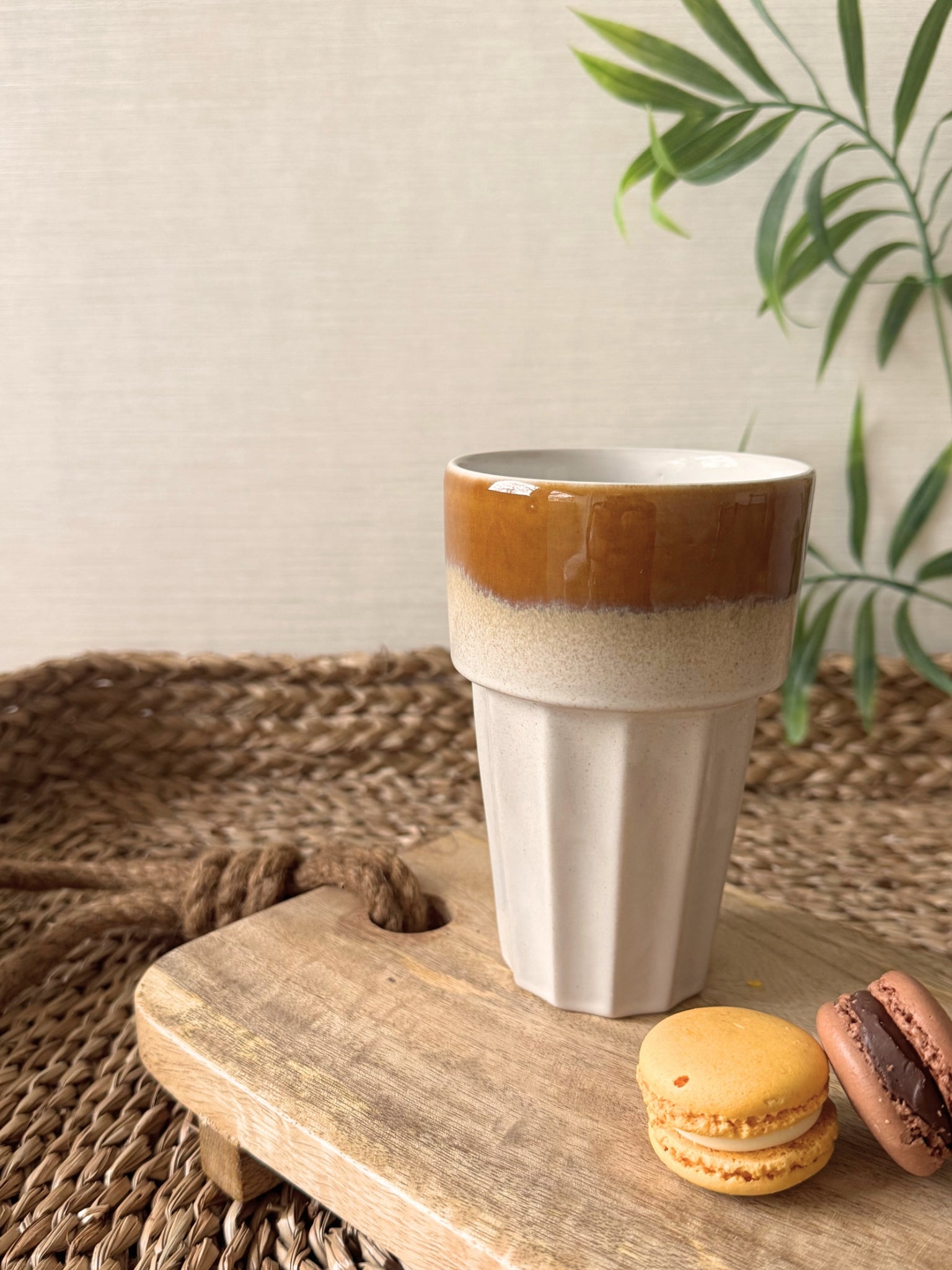 Deze hoge keramieken mok heeft een zachte mix van beige en bruin die zorgt voor een warme en natuurlijke uitstraling. De slanke vorm geeft hem een stijlvolle look en ligt prettig in de hand, ideaal voor een grote kop thee, cappuccino of warme chocolademelk. De mok voelt stevig aan en heeft een rustige, huislijke uitstraling die mooi past in verschillende serviescombinaties. Een fijne mok voor wie net wat meer inhoud wil.