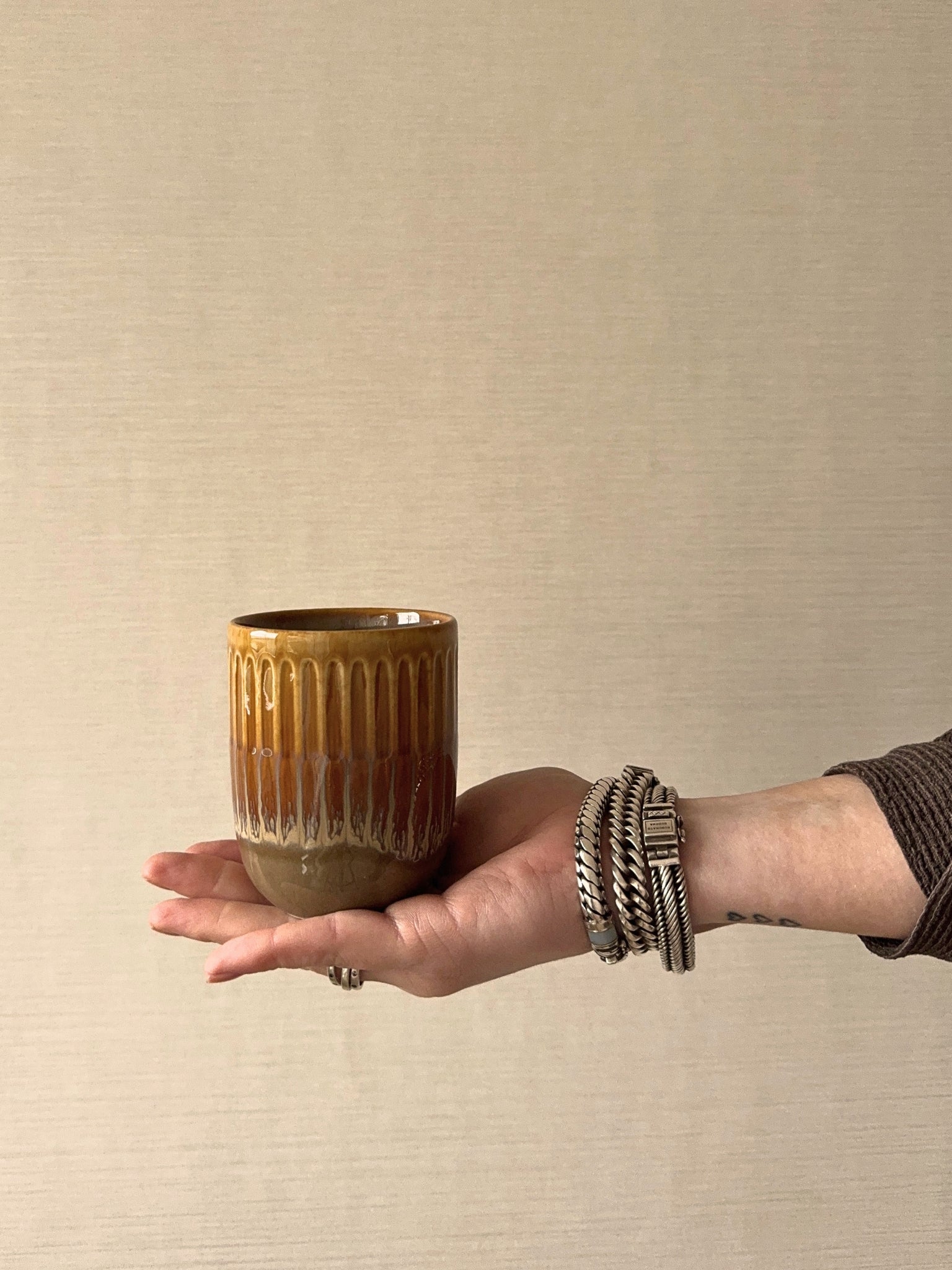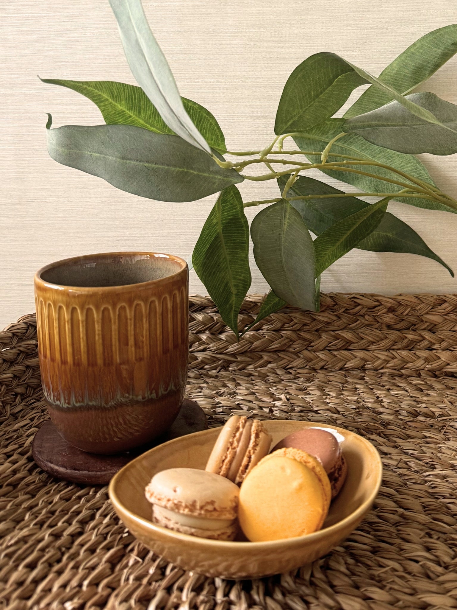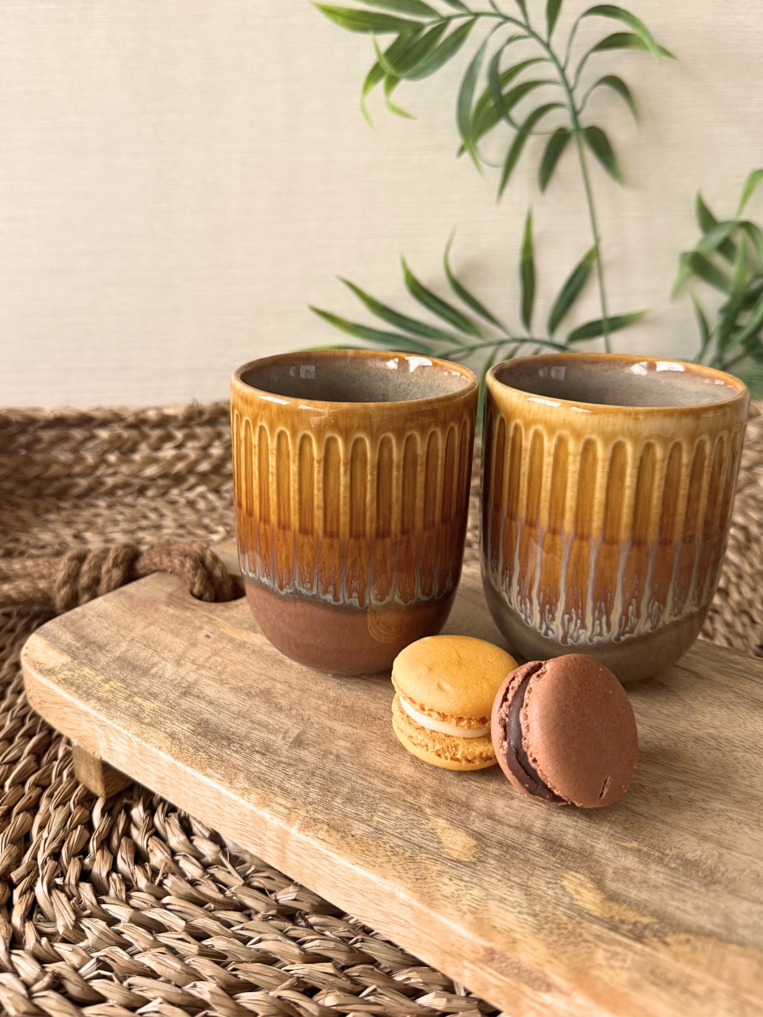 Deze keramieken mok heeft een warme okergele kleur met een subtiel groen detail, waardoor hij meteen een gezellige uitstraling geeft. De vorm ligt prettig in de hand en door de stevige rand drinkt hij fijn weg. Ideaal voor koffie, thee of een warme chocolademelk op een rustige ochtend of knusse avond. De mok voelt solide aan en voegt een vrolijk en huislijk detail toe aan je servieskast.