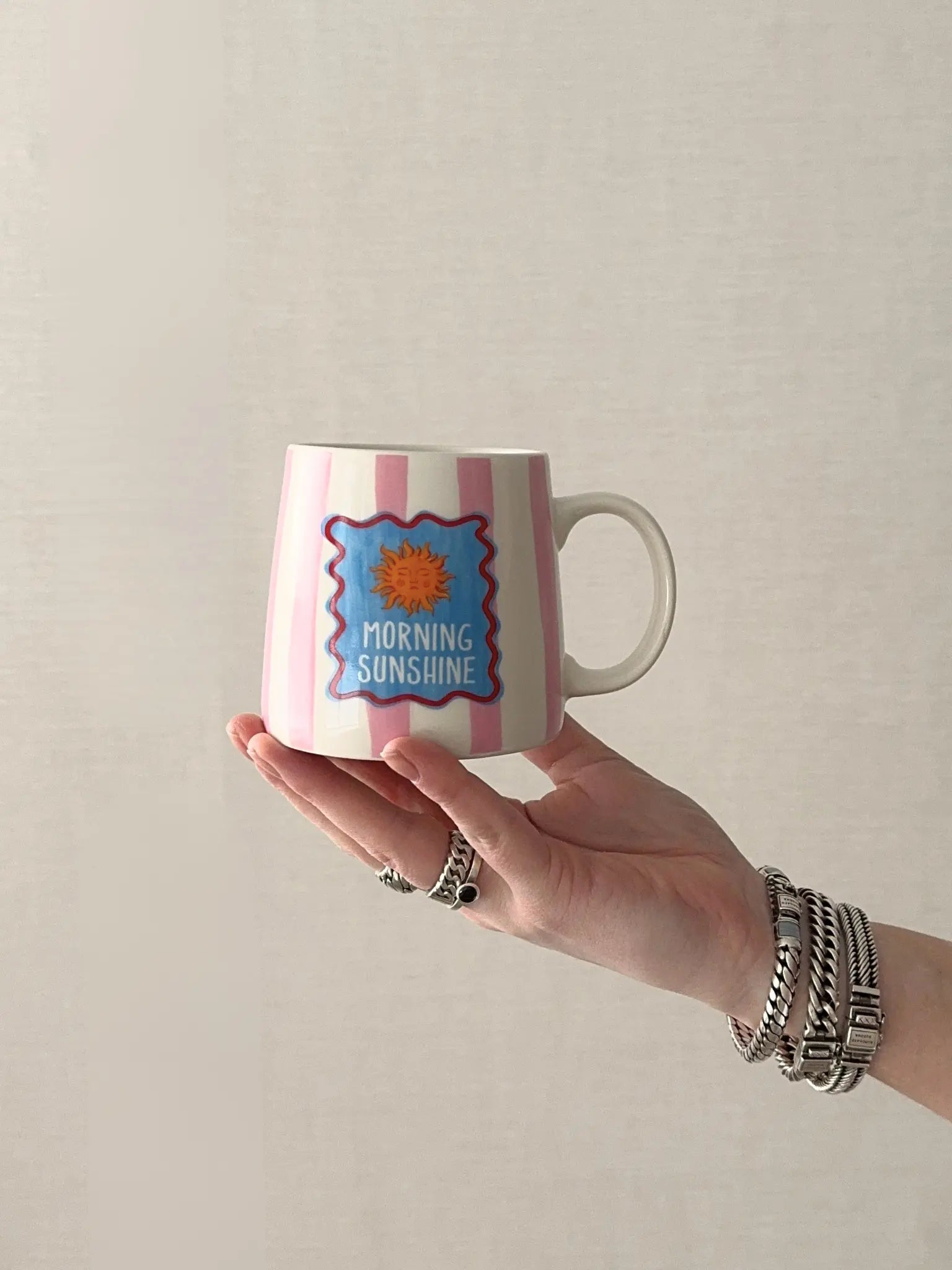 Mok Solare met de tekst morning sunshine brengt een warm en vrolijk gevoel naar je ochtendritueel. De speelse kleuren en zonnige uitstraling maken deze mok perfect om je dag mee te beginnen. Door het royale formaat is hij ideaal voor koffie, thee of een grote cappuccino. Het oor ligt prettig in de hand en het keramiek voelt stevig aan, waardoor de mok fijn is voor dagelijks gebruik. Een mok die letterlijk en figuurlijk zorgt voor een beetje zon op tafel.