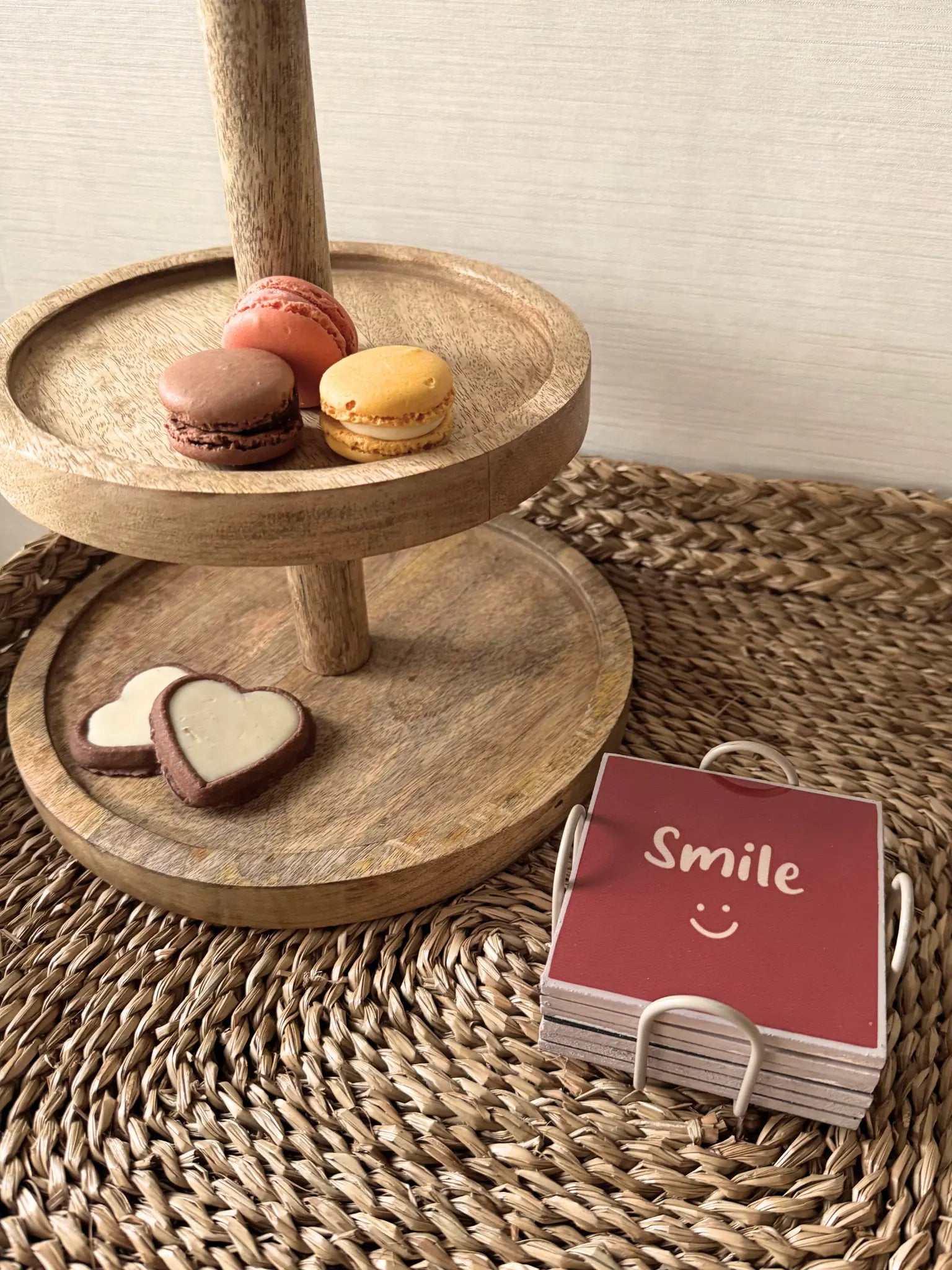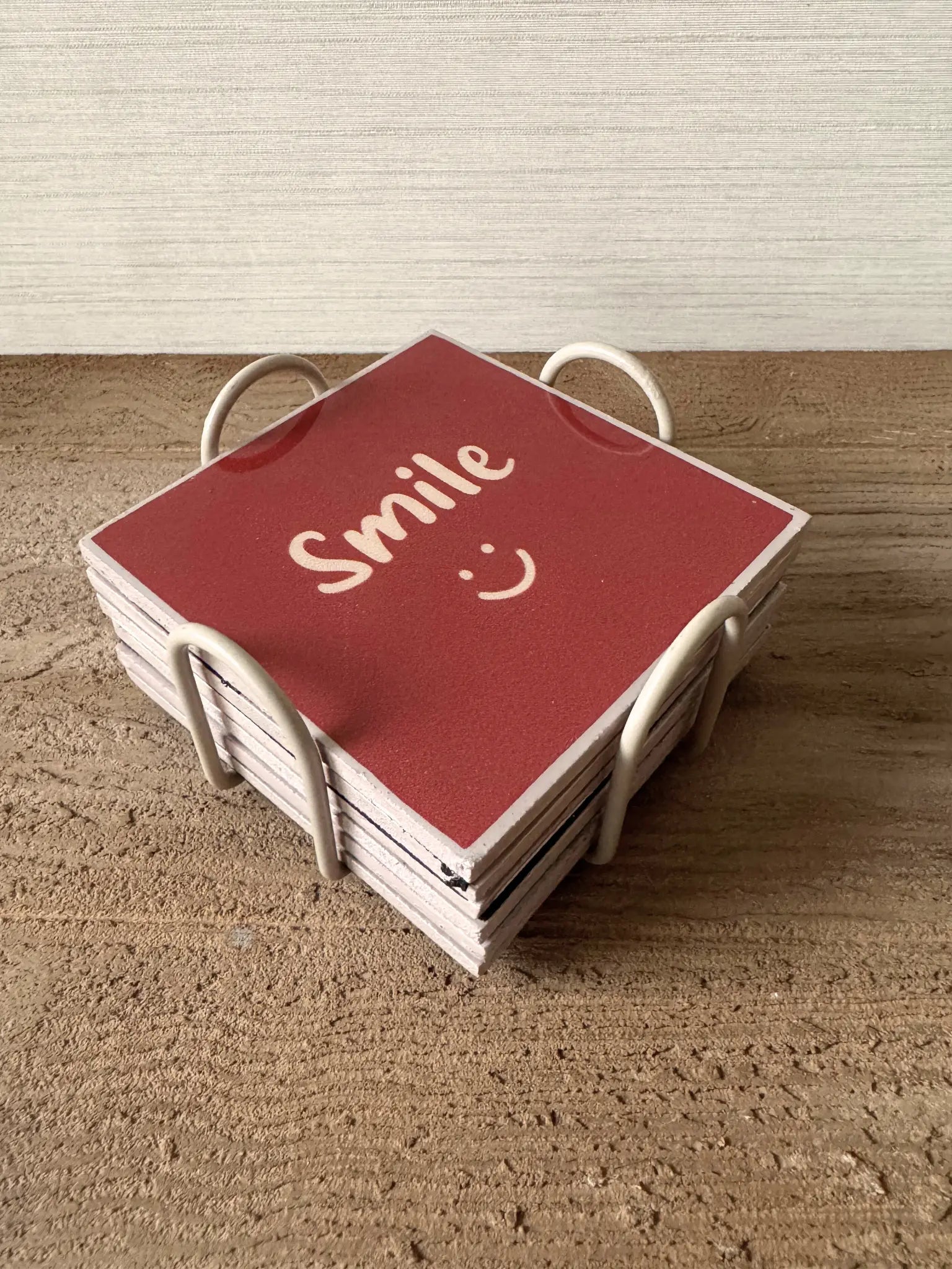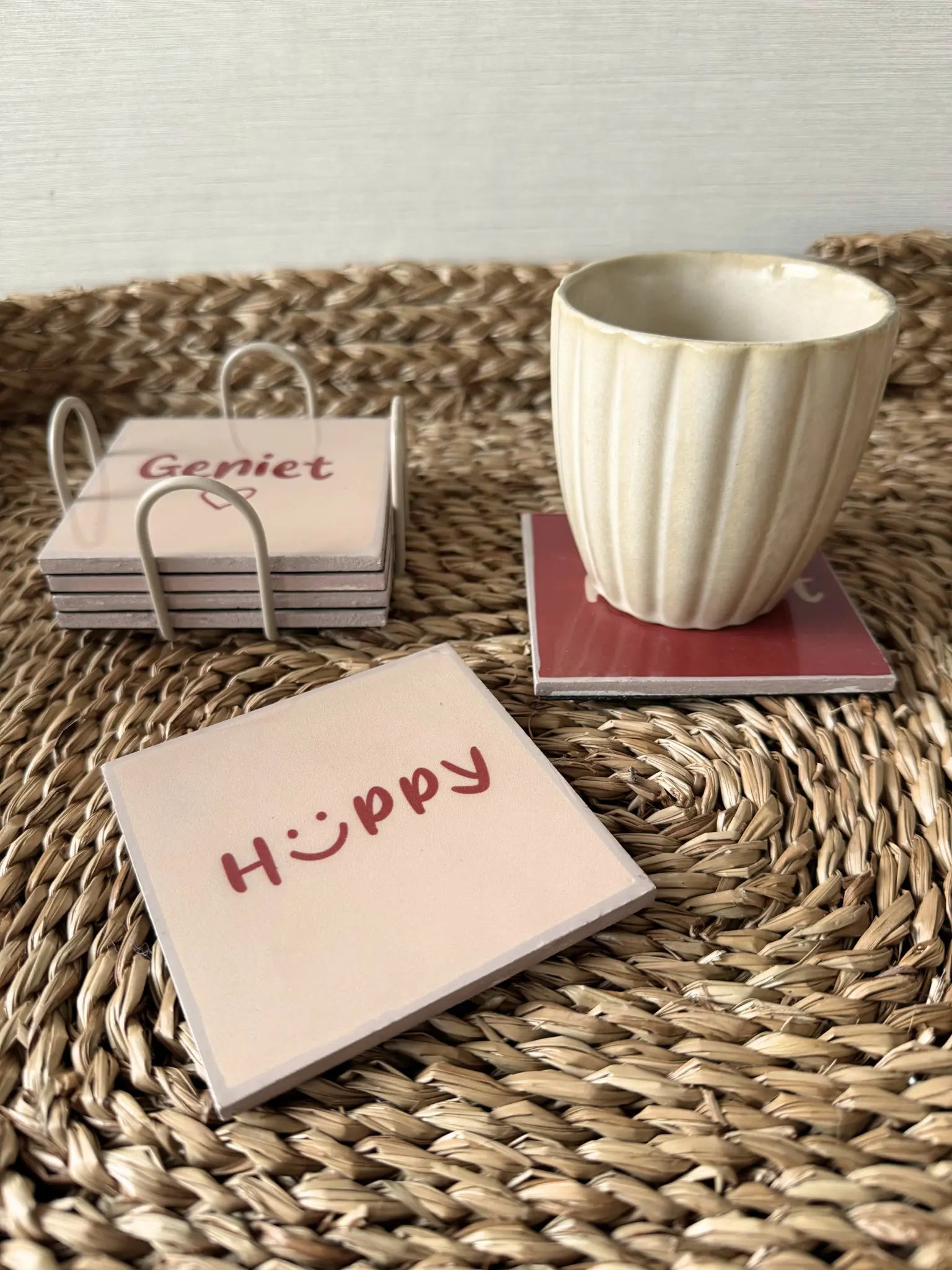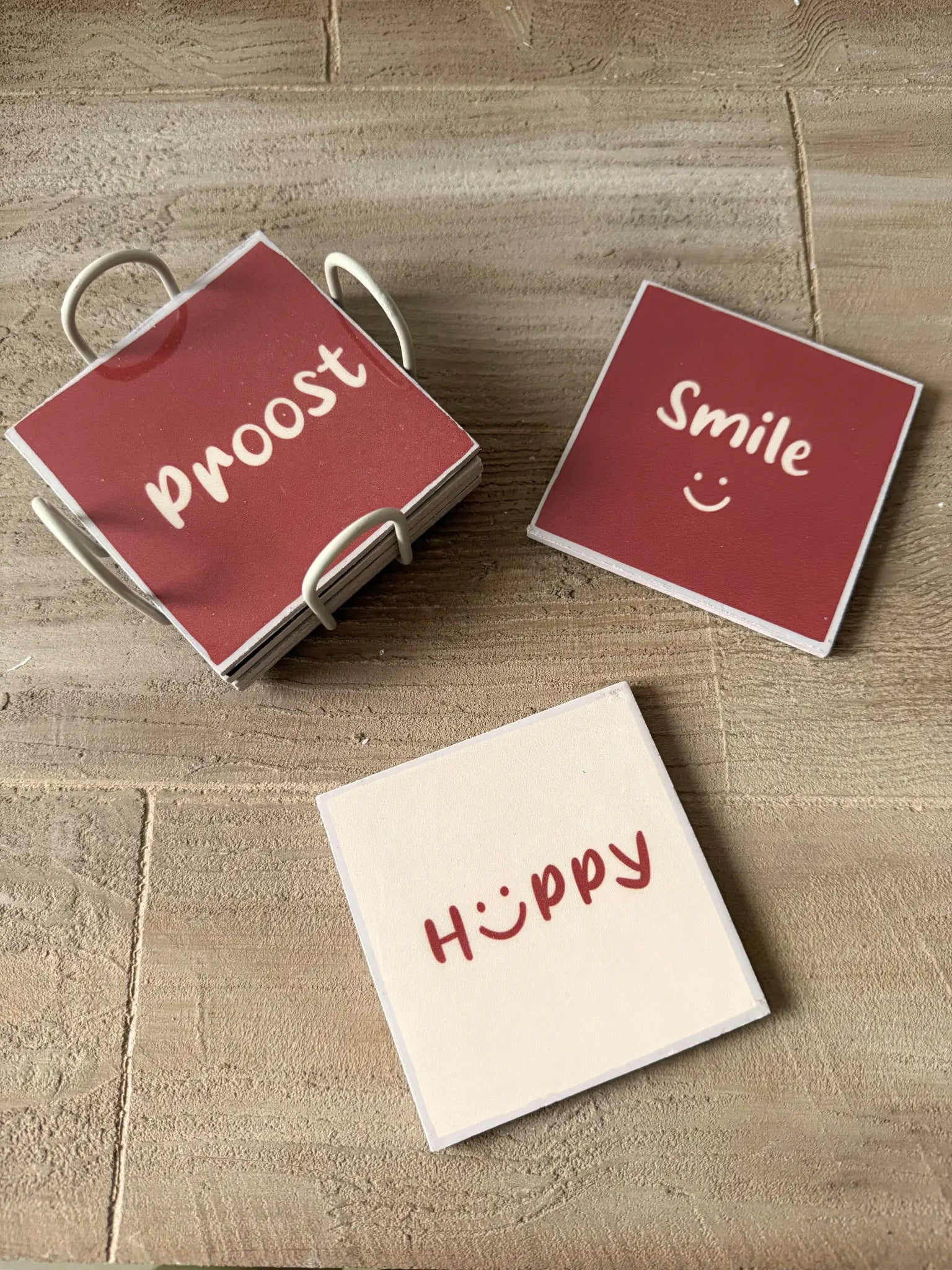 Deze set onderzetters met rekje brengt een warm en gezellig detail op tafel. De beige en rode kleur en het metalen rekje zorgen voor een rustige en nette uitstraling, terwijl de zes verschillende onderzetters samen een speels geheel vormen. Perfect om glazen, mokken of kopjes op te zetten tijdens een borrel of koffiemoment. Het compacte rekje houdt alles netjes bij elkaar en staat mooi op tafel of in de keuken. Een praktisch en sfeervol item waar je elke dag plezier van hebt.