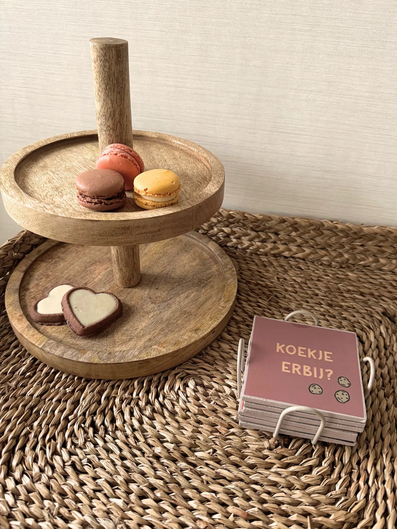 Deze set onderzetters met rekje brengt een warm en gezellig detail op tafel. De verschillende kleuren en het metalen rekje zorgen voor een rustige en nette uitstraling, terwijl de zes verschillende onderzetters samen een speels geheel vormen. Perfect om kopjes op te zetten tijdens een koffiemoment. Het compacte rekje houdt alles netjes bij elkaar en staat mooi op tafel of in de keuken. Een praktisch en sfeervol item waar je elke dag plezier van hebt.