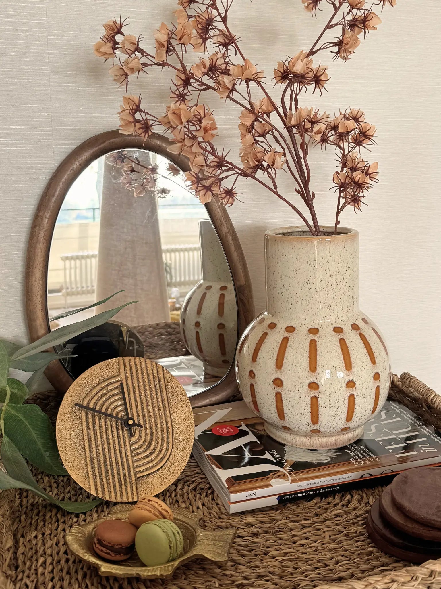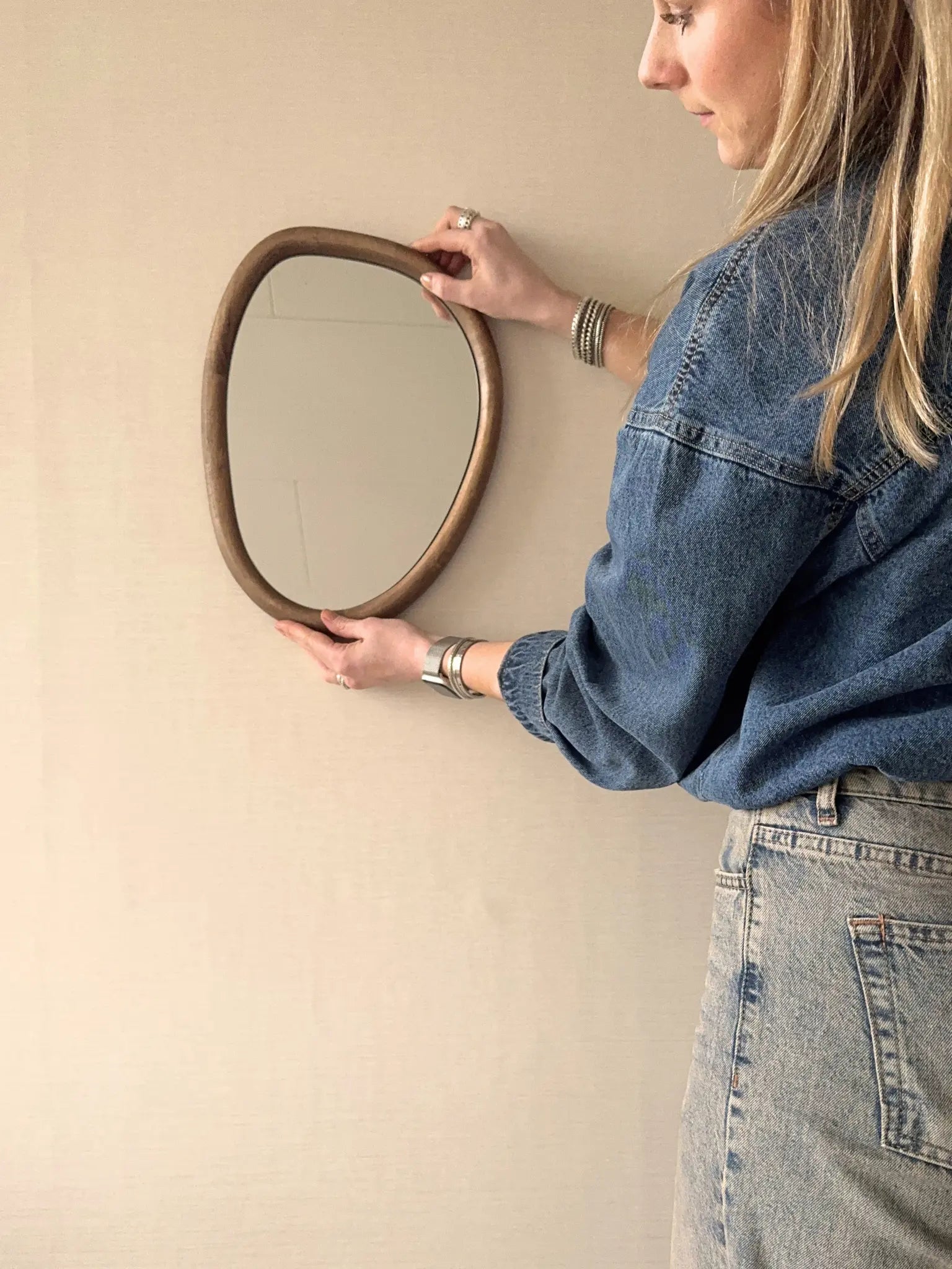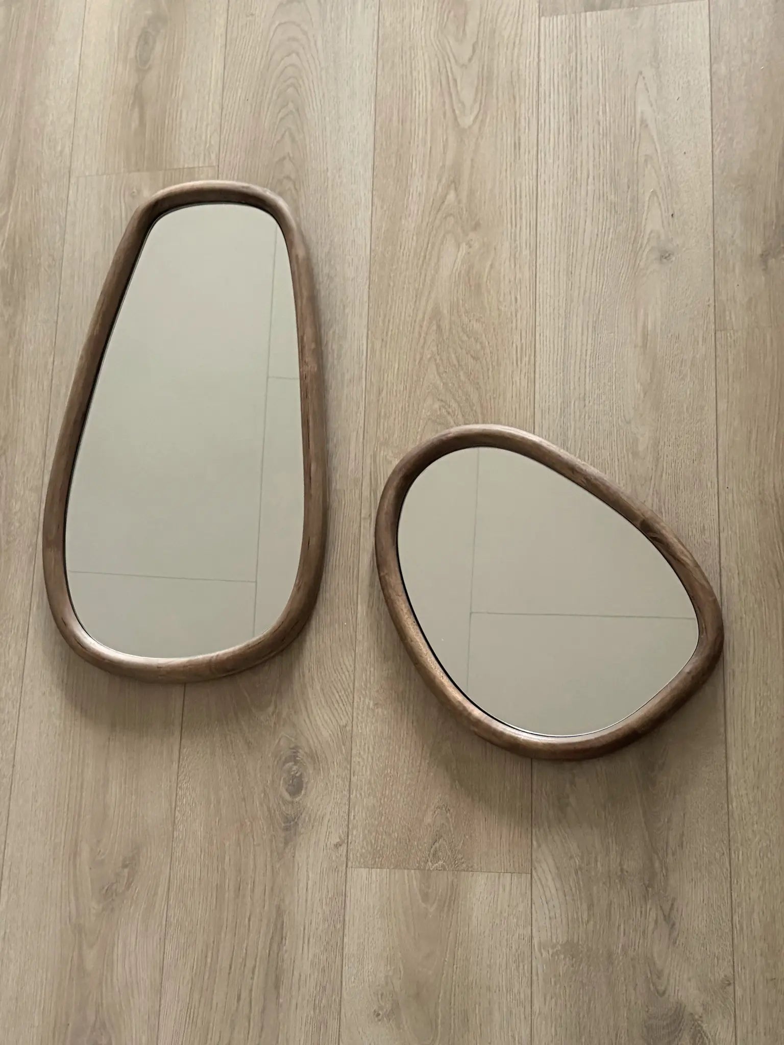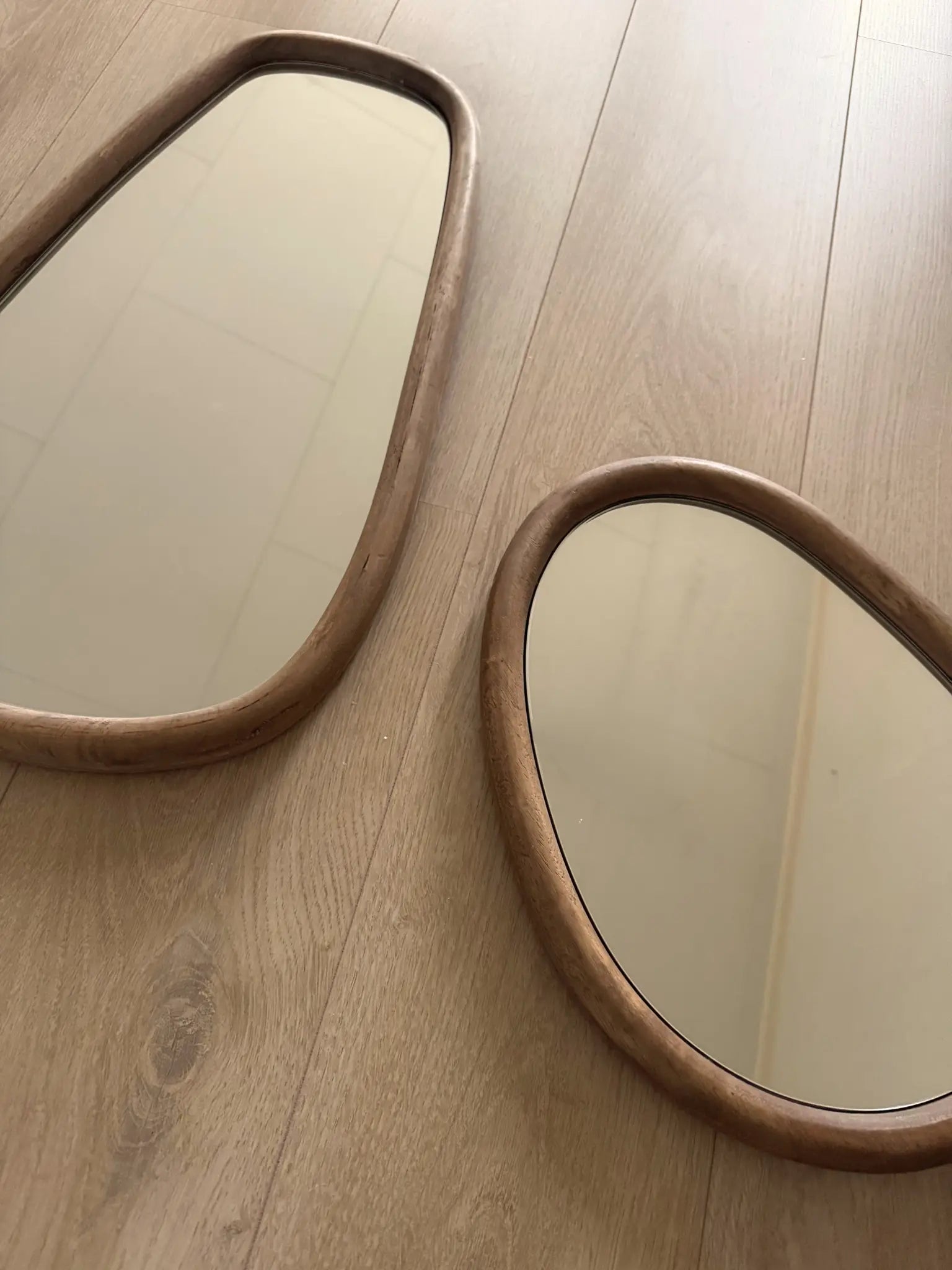 Deze organische spiegel brengt een zachte en natuurlijke uitstraling in huis. De vloeiende vorm en de houten lijst in naturel tint zorgen voor een warm en rustig accent dat perfect past in een modern of natuurlijk interieur. Je kunt de spiegel gebruiken in de hal, slaapkamer of woonkamer als decoratief item dat meteen sfeer geeft. De speelse vorm maakt elke muur net wat interessanter zonder dat het te druk wordt. Door de twee verschillende formaten kies je precies wat past bij jouw ruimte of combineer je ze voor een mooi geheel.