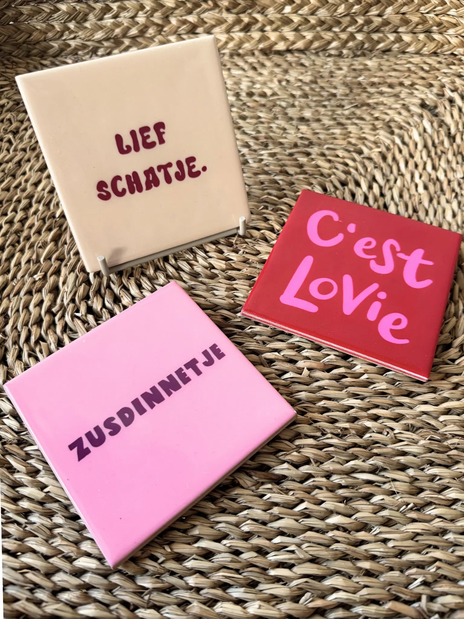 Dit tegeltje heeft een lieve en zachte uitstraling die meteen warm aanvoelt. De combinatie van crème en roze geeft een rustige en romantische sfeer die mooi past op een plankje, in een slaap of woonkamer of als klein cadeautje voor iemand die je dierbaar is. Het keramiek voelt stevig en mooi aan en brengt een zacht en huislijk detail in je interieur.