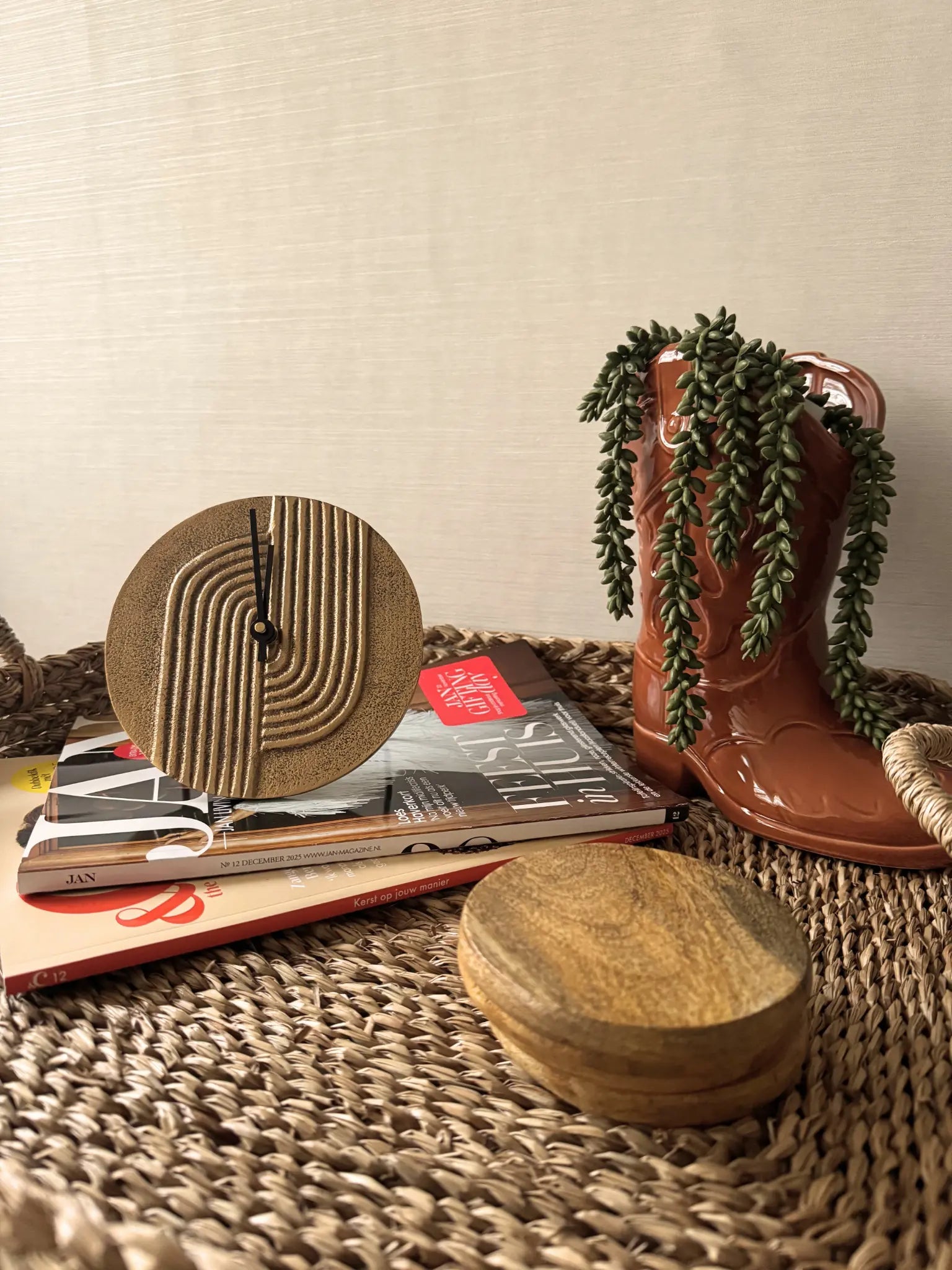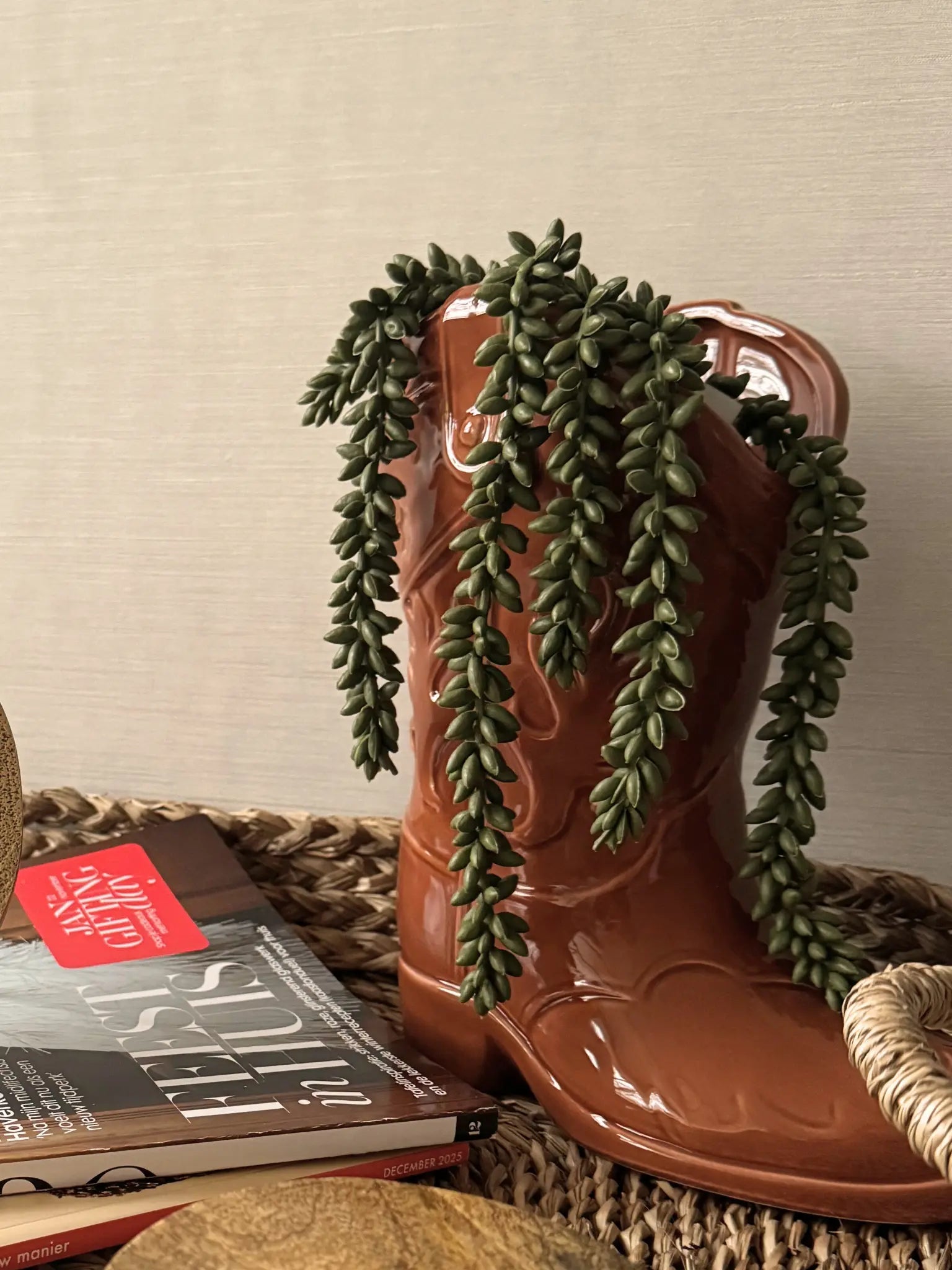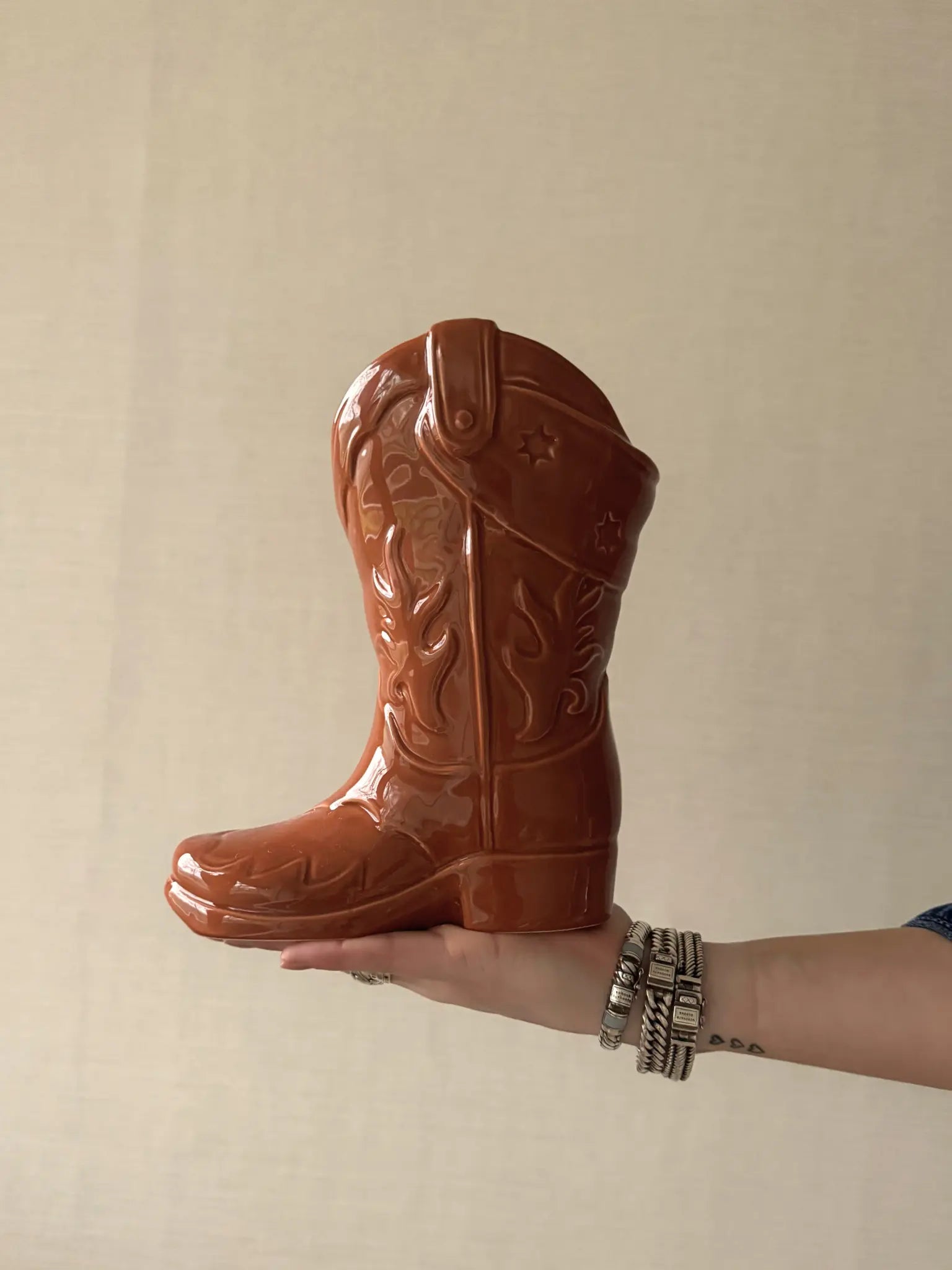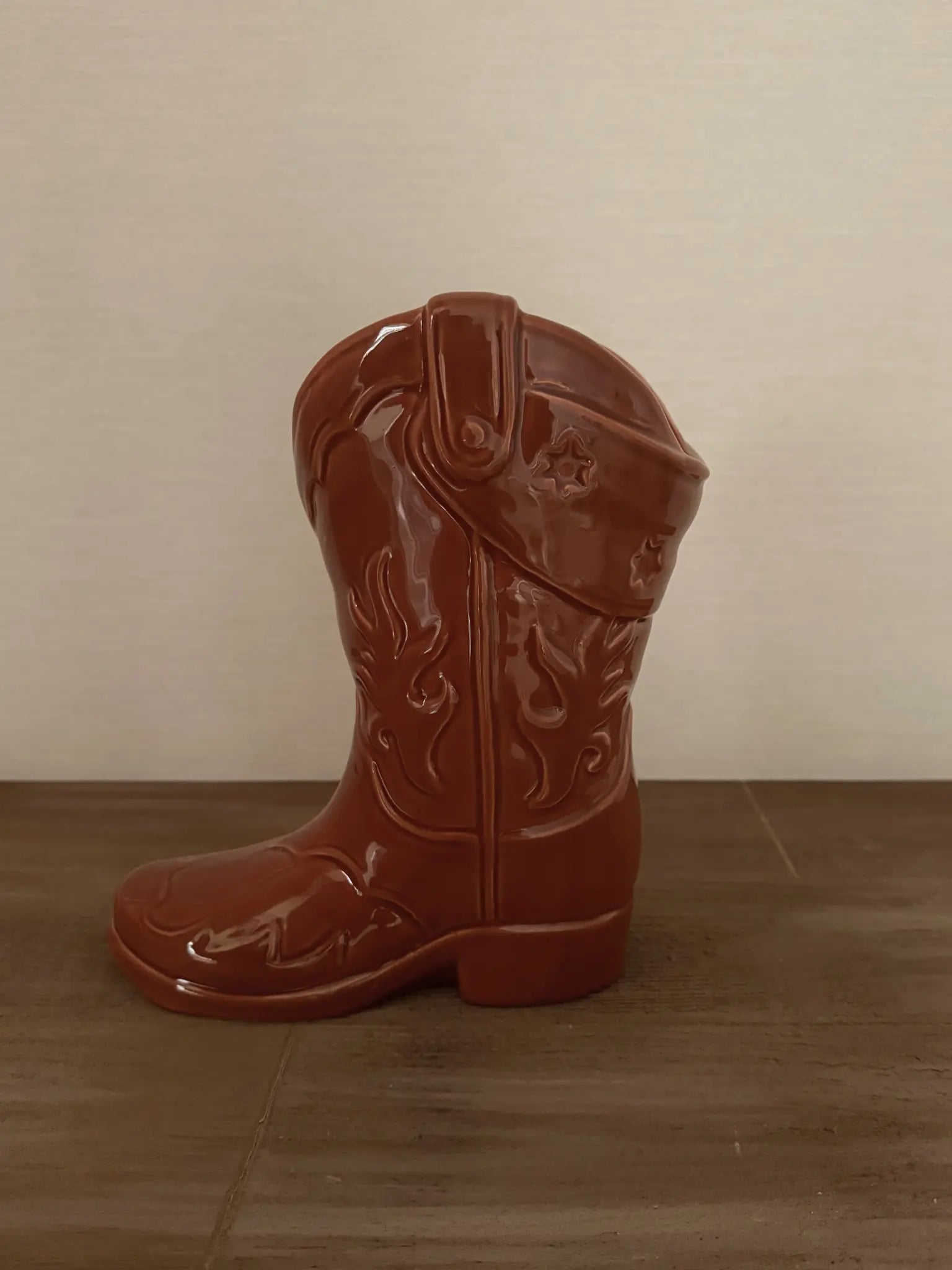Deze aardewerk vaas in de vorm van een cowboylaars is een vrolijke en unieke toevoeging aan je interieur. De warme bruine kleur en het speelse ontwerp zorgen voor een stoere en gezellige uitstraling die mooi past op een kast, vensterbank of sidetable. Het is een item dat meteen opvalt en je ruimte net dat beetje extra karakter geeft. De vaas komt prachtig tot zijn recht met droogbloemen of kunstbloemen en geeft zo een warm en huislijk accent aan je styling.