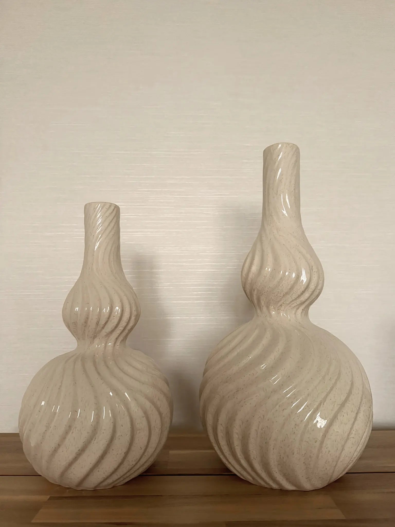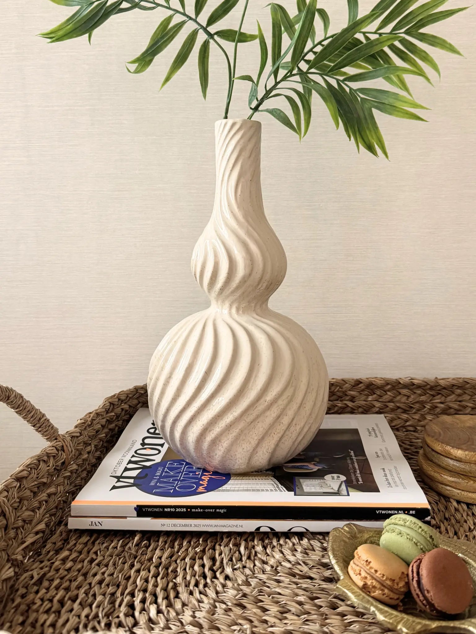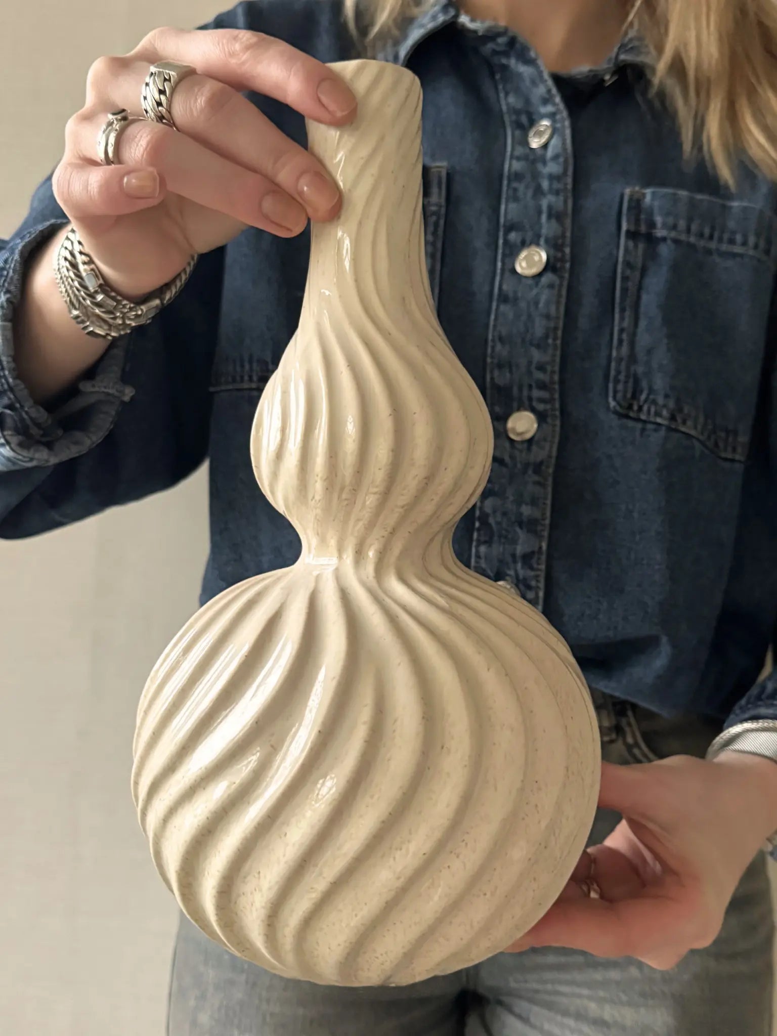 Deze krullende vaas heeft een zachte en elegante uitstraling. De beige kleur en de speelse vormen geven de vaas een organisch en rustig karakter dat prachtig past in een modern of natuurlijk interieur. De structuur van het aardewerk zorgt voor een warme en tijdloze look. De twee varianten hebben dezelfde stijl maar een eigen feel: de hogere versie heeft een slanke en elegante uitstraling, terwijl het lagere model juist wat speelser en voller oogt. Je kunt ze los stylen of als duo voor een mooie set.