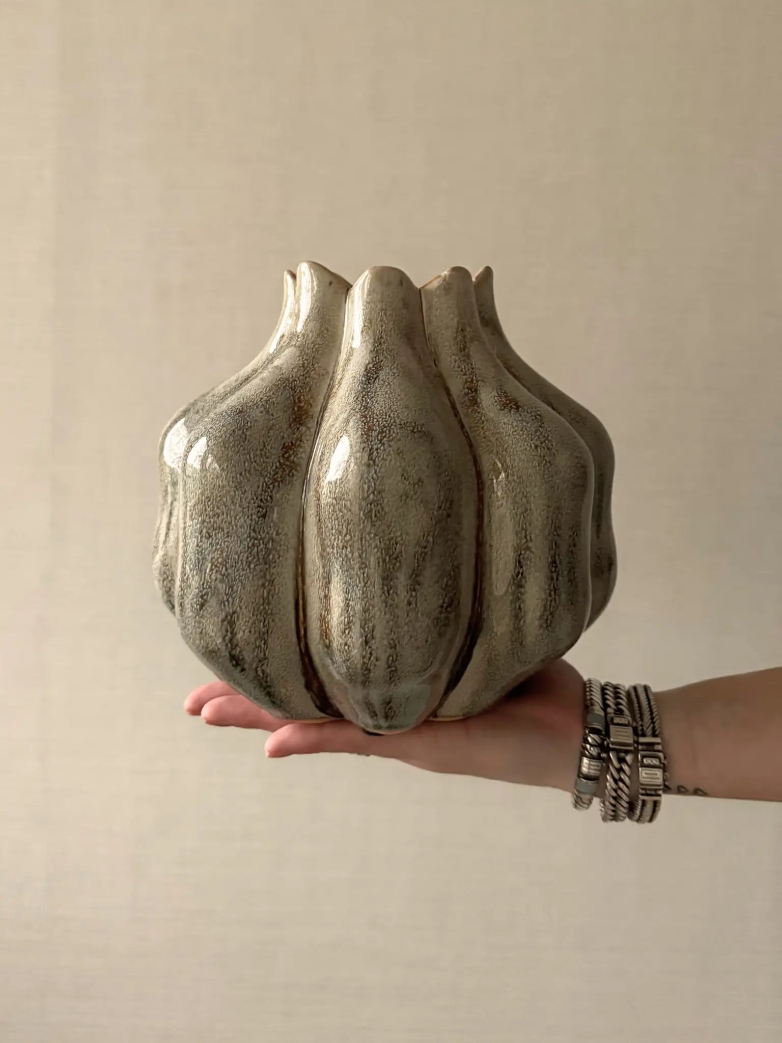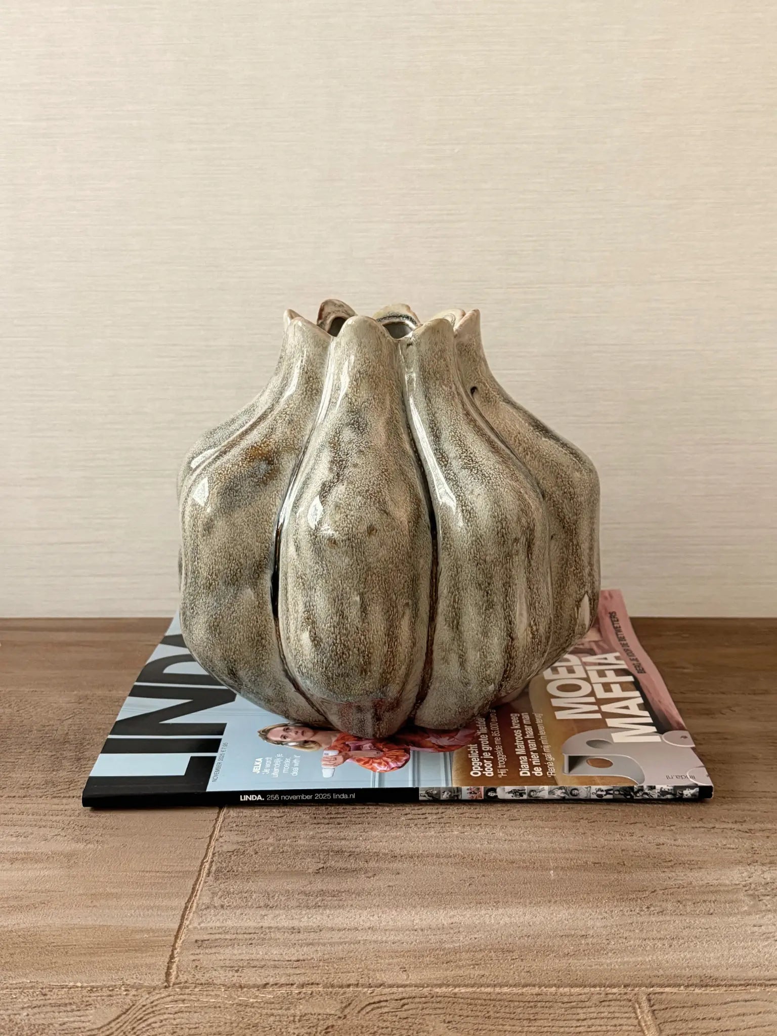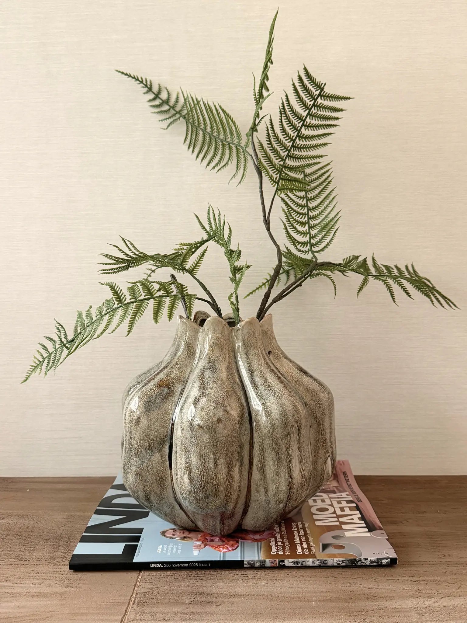 Deze organische vaas heeft een unieke en rustgevende uitstraling. De zachte mix van groen en blauw geeft een kalm en natuurlijk effect dat mooi past in een modern, landelijk of rustig interieur. De golvende vorm en glanzende afwerking zorgen voor een speels en luxe gevoel, waardoor de vaas meteen opvalt zonder overheersend te zijn. Hij staat prachtig op een dressoir, salontafel of eettafel en combineert mooi met kunstgroen, takken of droogbloemen. Ook zonder bloemen is het een stijlvol object dat warmte en karakter toevoegt aan je ruimte.