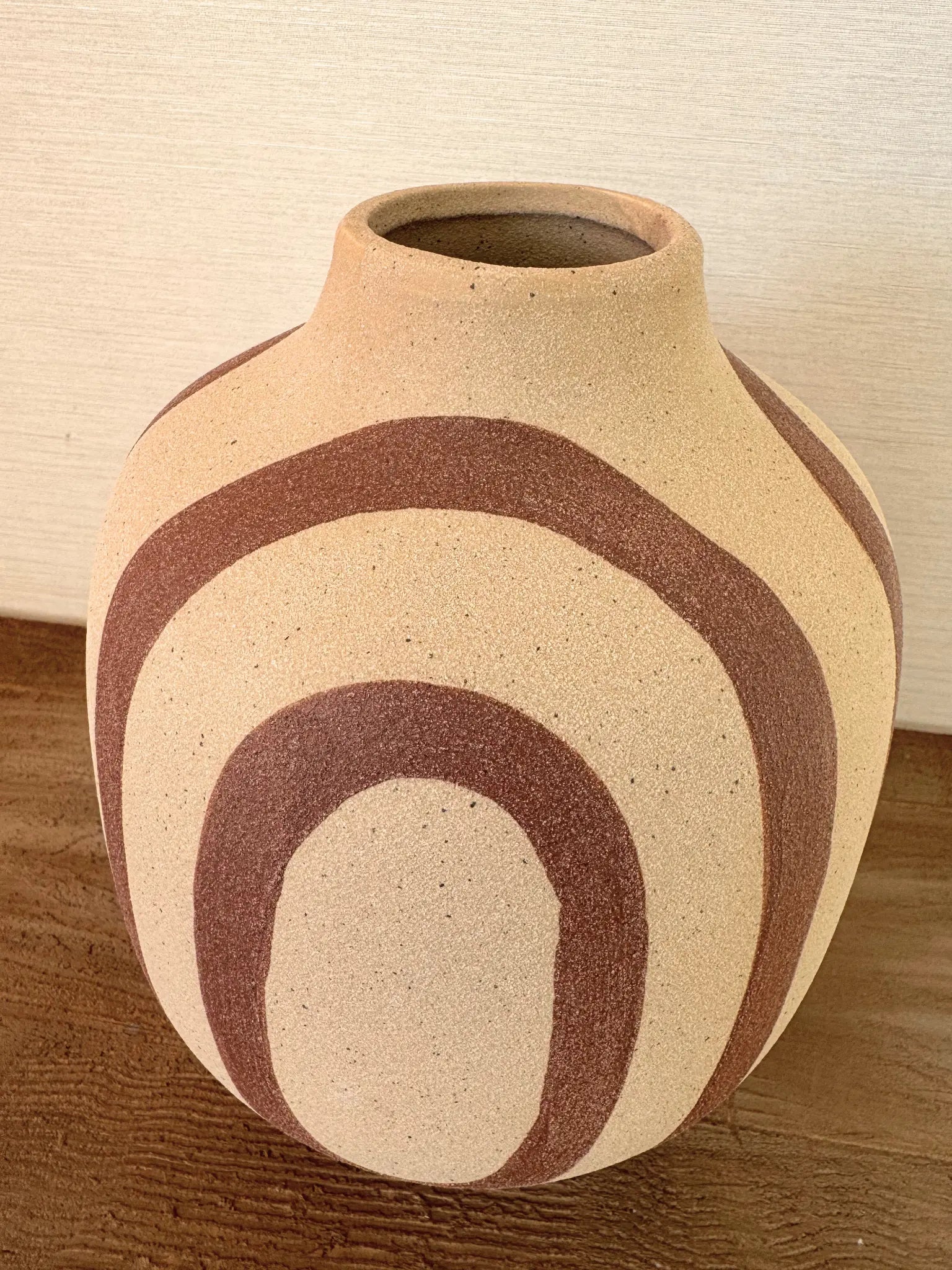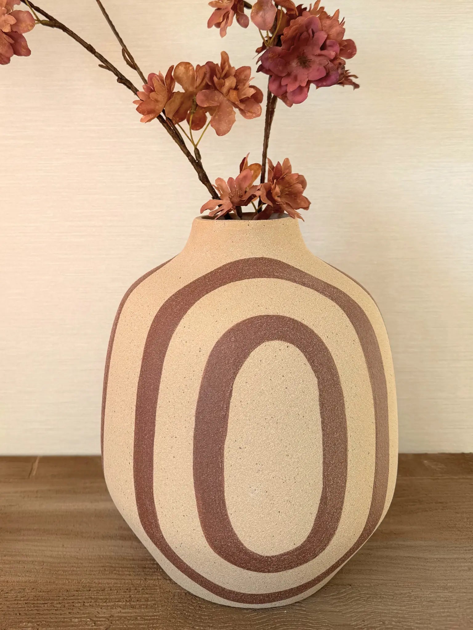 Vaas UMYA heeft een warme en aardse uitstraling die direct sfeer toevoegt aan je interieur. De matte zand terra tint en ronde vorm zorgen voor een rustige, natuurlijke look die mooi past binnen verschillende woonstijlen. De vaas staat prachtig op zichzelf op een dressoir of tafel, maar komt ook mooi tot zijn recht met een paar droogbloemen of een losse tak.