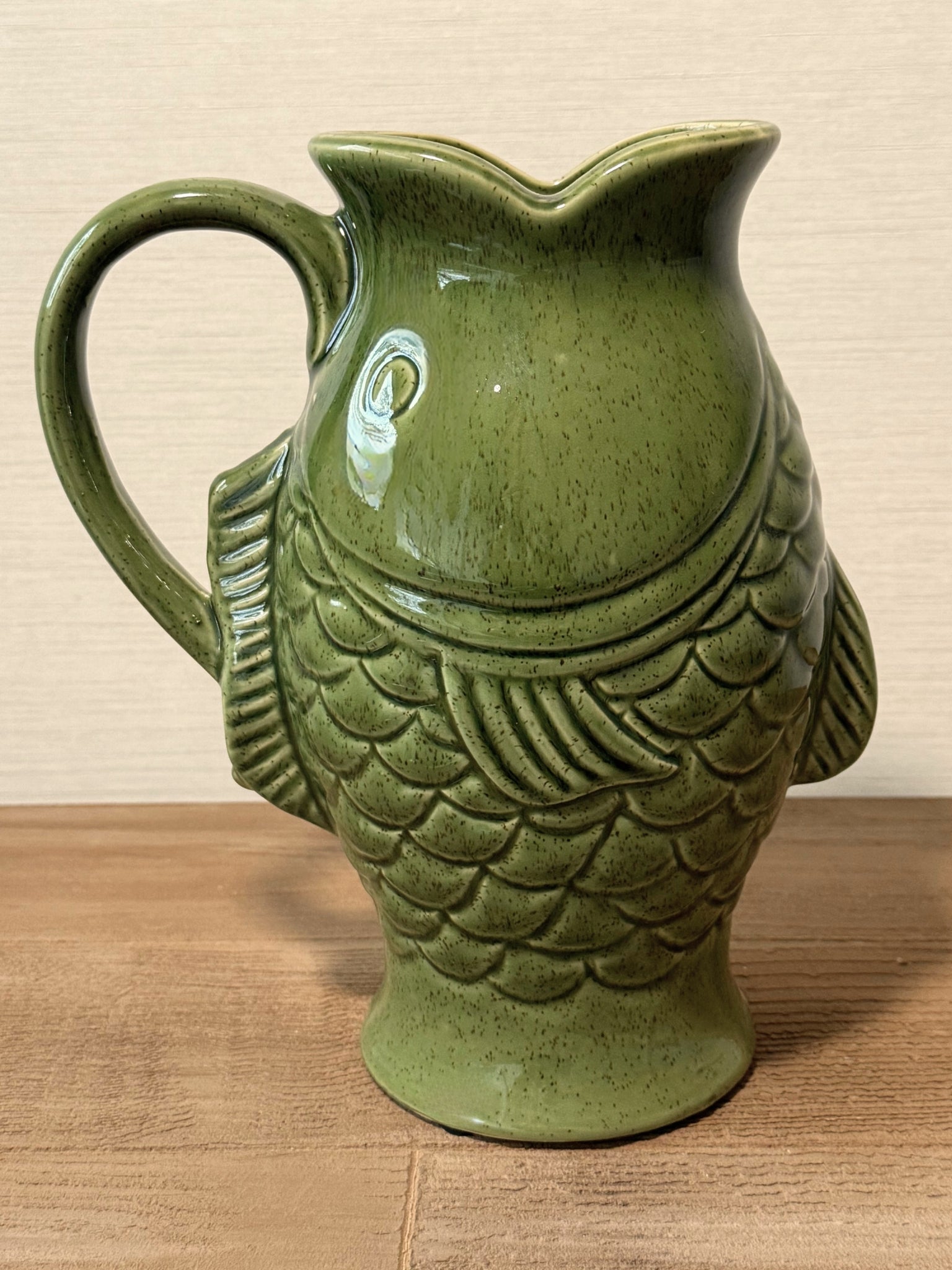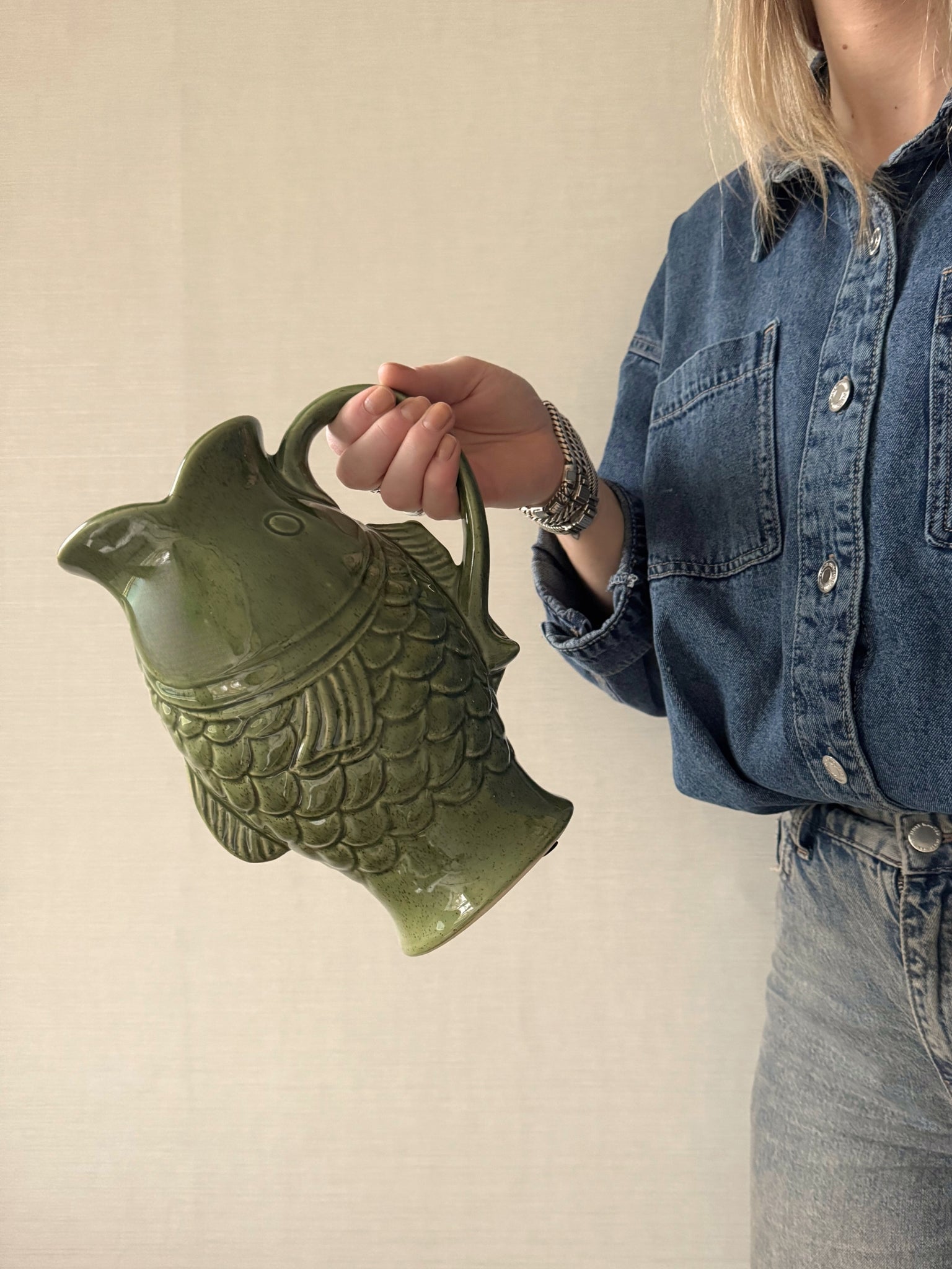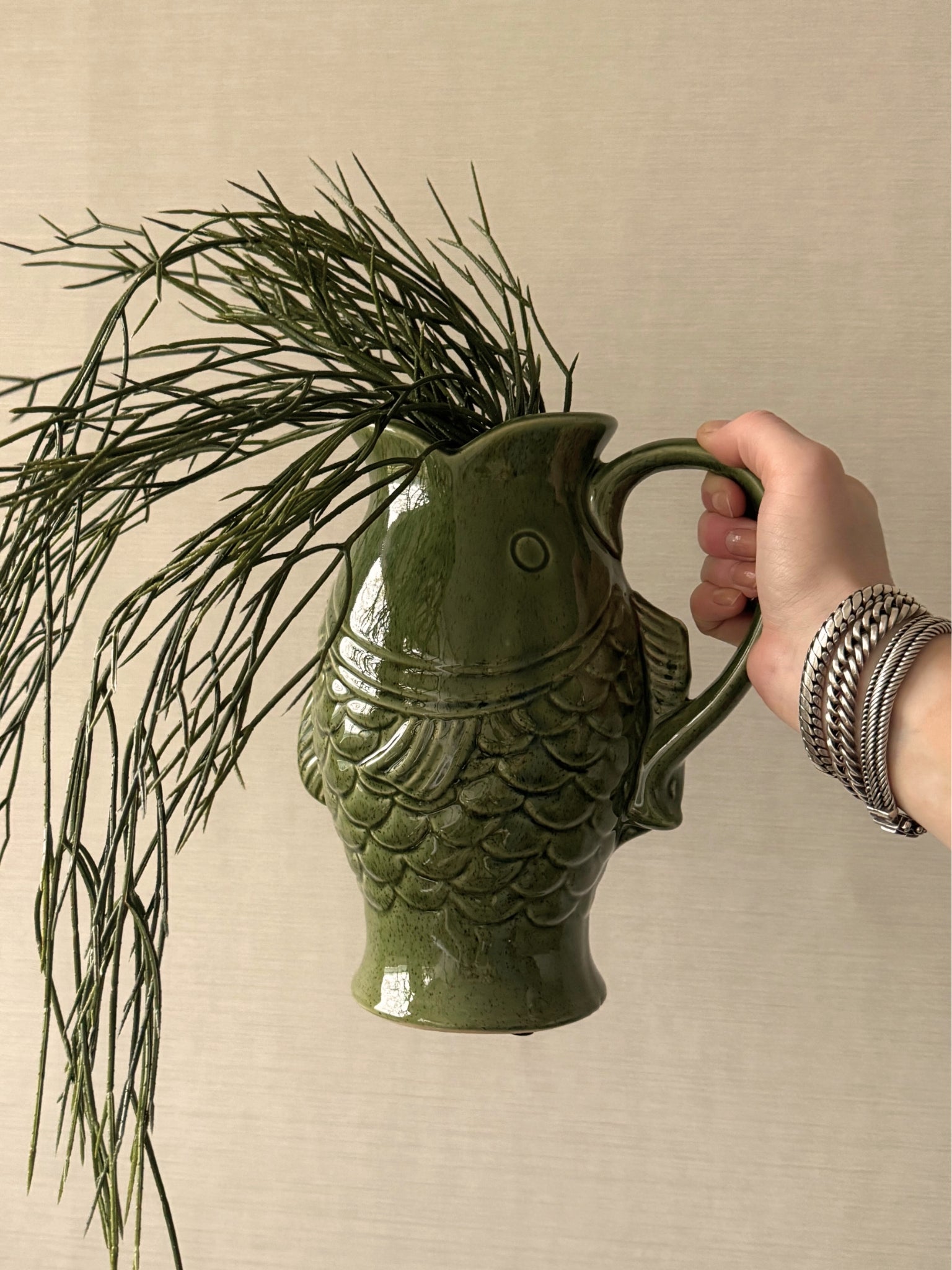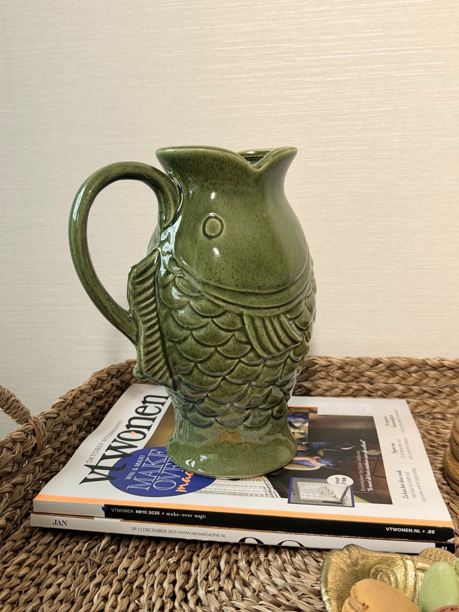 Deze vaas in de vorm van een vis is een speels en sfeervol item dat meteen karakter toevoegt aan je interieur. De diepe donkergroene kleur en de organische vorm zorgen voor een warme en bijzondere uitstraling die mooi past op een dressoir, tafel of in een open kast. De details in het aardewerk geven de vaas een luxe en handgemaakte look. Perfect om te gebruiken met droogbloemen, kunstbloemen of als decoratief object op zichzelf.
