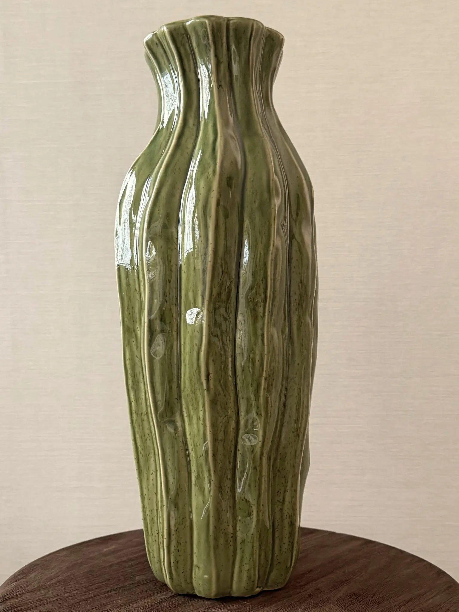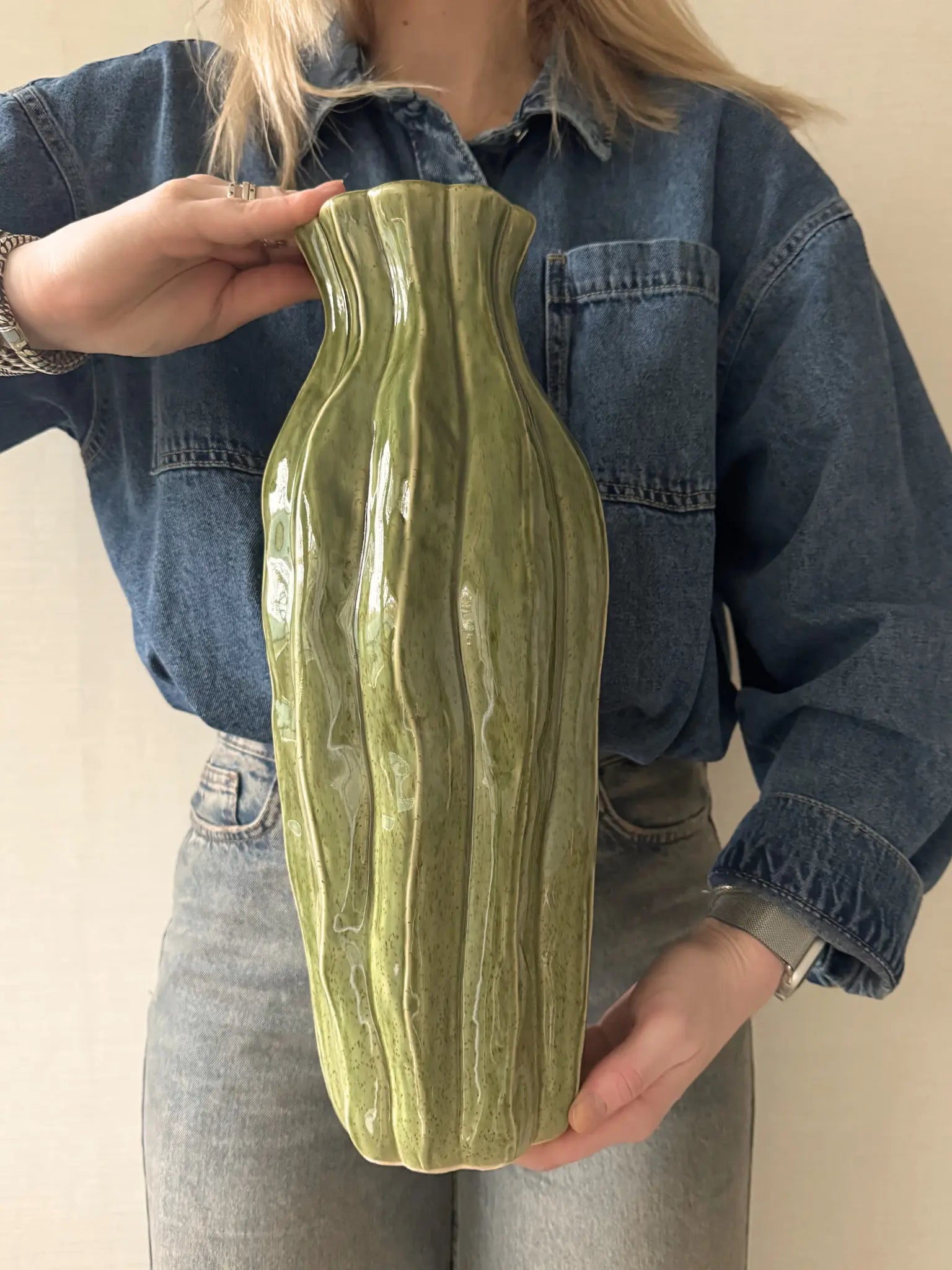 Deze vaas in de vorm van een vis is een speels en sfeervol item dat meteen karakter toevoegt aan je interieur. De diepe donkergroene kleur en de organische vorm zorgen voor een warme en bijzondere uitstraling die mooi past op een dressoir, tafel of in een open kast. De details in het aardewerk geven de vaas een luxe en handgemaakte look. Perfect om te gebruiken met droogbloemen, kunstbloemen of als decoratief object op zichzelf.